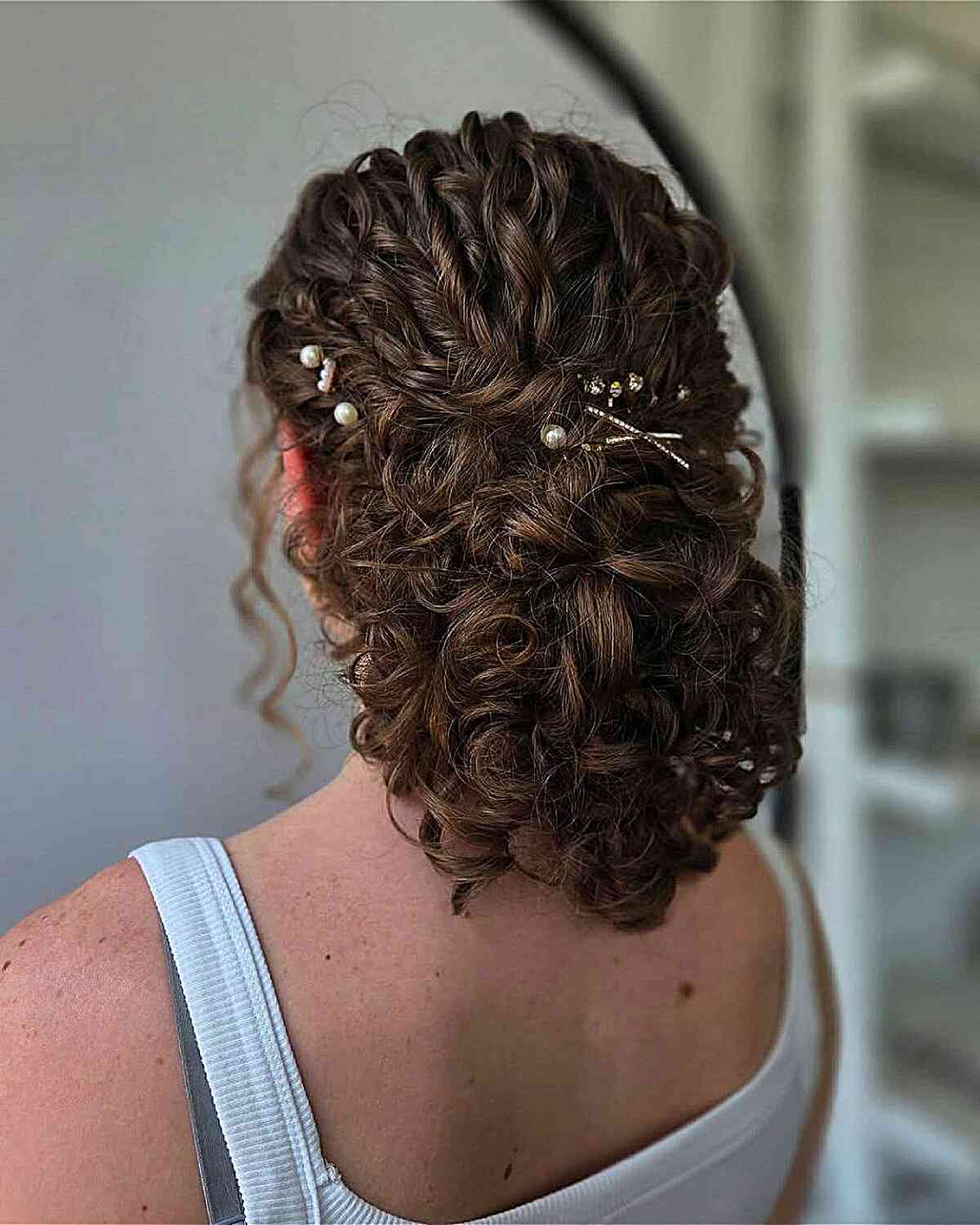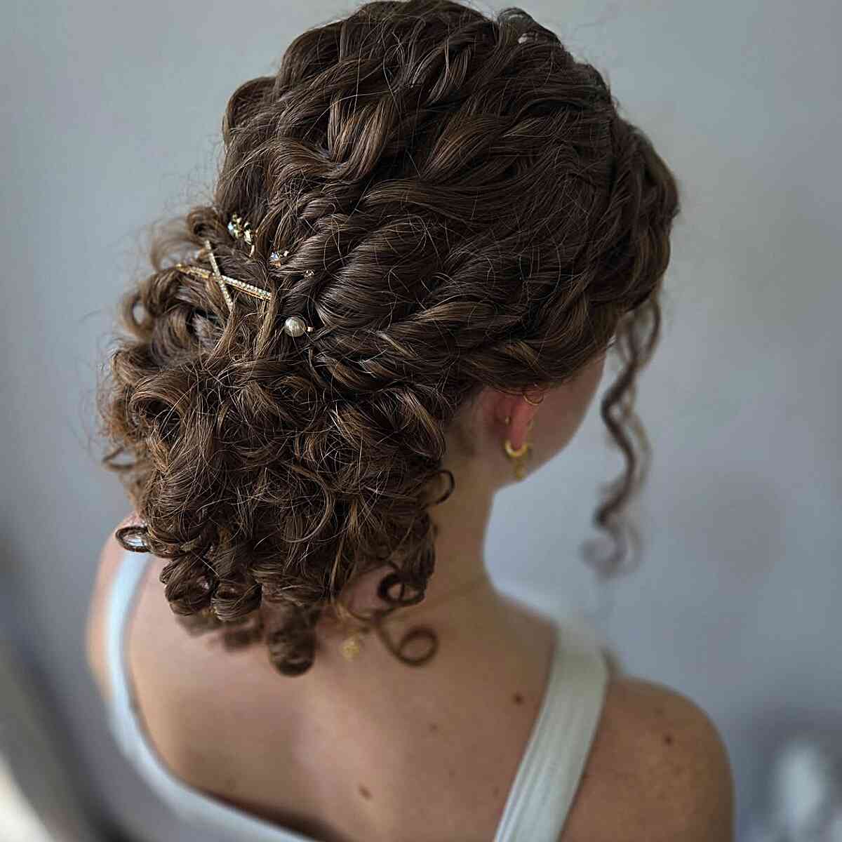 This stunning curly updo showcases medium-length hair styled into defined curls, offering a beautiful texture. Ideal for oval or heart-shaped faces, this hairstyle features intricate braiding at the top, leading to loose, bouncy curls at the bottom, creating a soft silhouette. Accented with delicate hairpins and pearls, it adds a touch of elegance. Perfect for formal events, this look requires minimal products for hold and shine, making it both stylish and easy to maintain.
