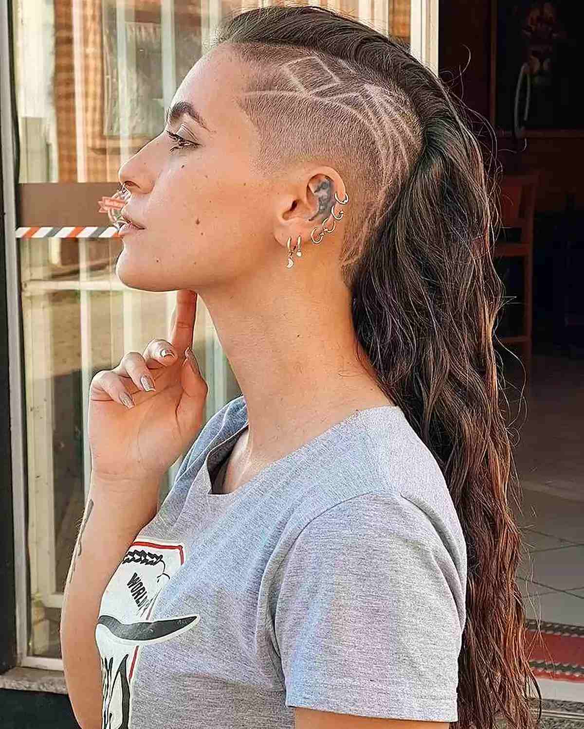 This hairstyle features shaved sections underneath, allowing you to reveal as much or as little of your adventurous side! It’s perfect for a woman with a full mane or even lengthy hair since you maintain your length while eliminating excess bulk. This reduces the effort needed for styling long hair, as you end up with less to manage. With your length intact, you can still create curls and embrace your feminine flair. If you’re feeling daring, style it into a creative braided updo or a simple bun, and you’re embodying the mohawk trend!