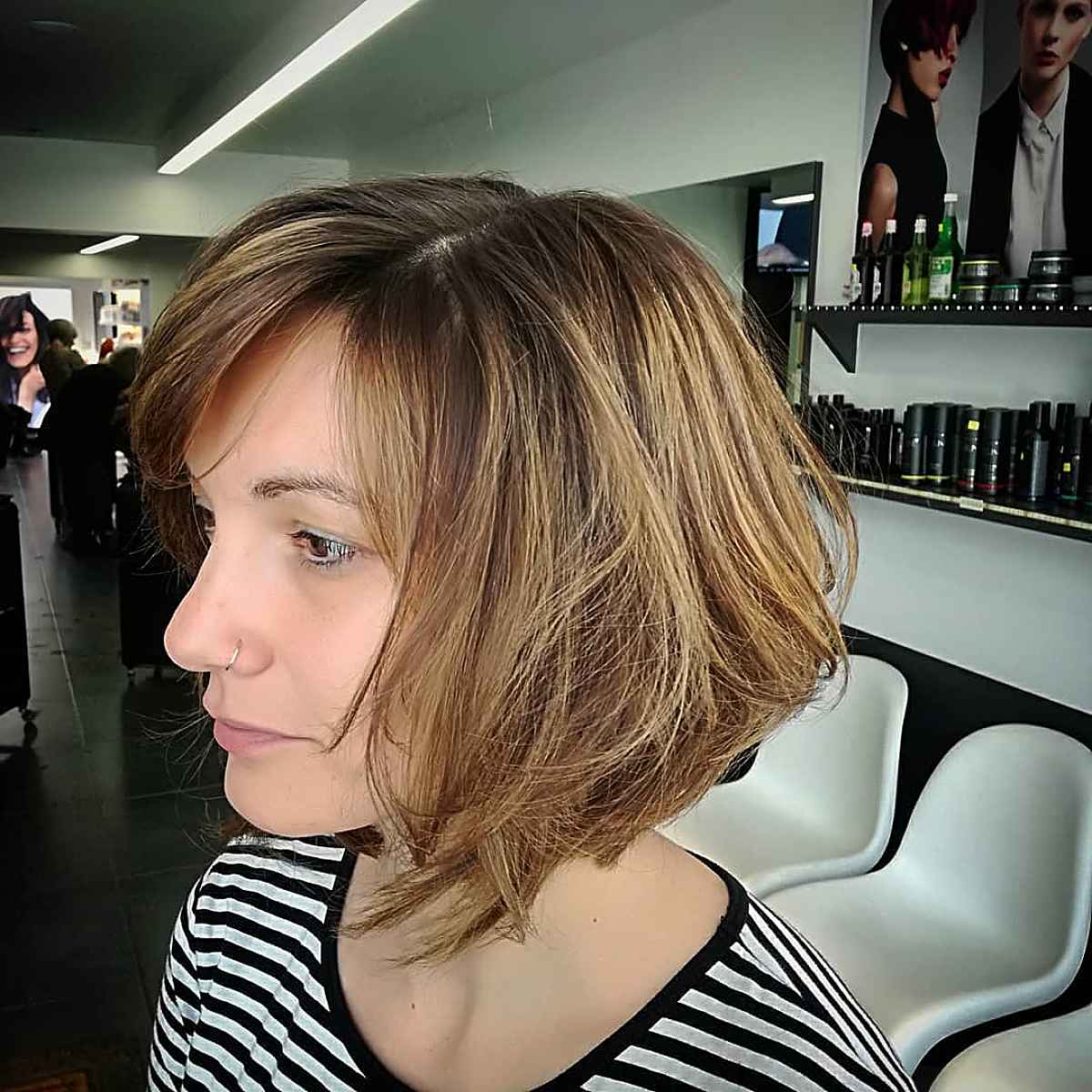 Give an inverted bob extra choppy layers by asking a stylist for a razor cut. It adds a soft and edgy texture to fine locks while giving it an illusion of thick hair. For a more lived-in look, paint your choppy bob with a blonde balayage. The dimensional illusion should enhance the hair texture, as well.