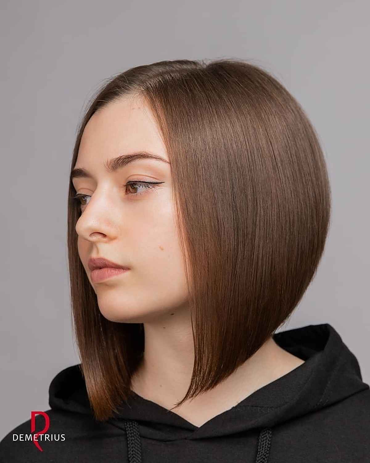 Here’s a quintessential bob, designed to enhance fine hair! A straight inverted bob showcases a shorter back with an elongated front. This cut features a sharp, curved edge that complements fine, straight hair textures.