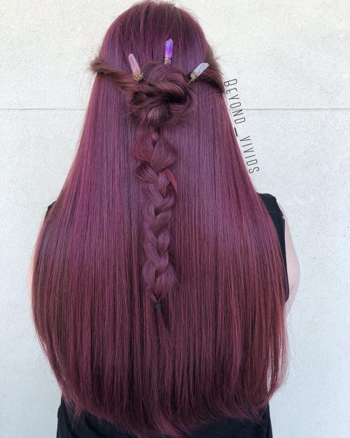 This red-violet hair color features an electrifying magenta hue that is a bolder interpretation of the pink hair trend for this year. Showcase this eye-catching color with a simple half-up loose braid using your long mane!