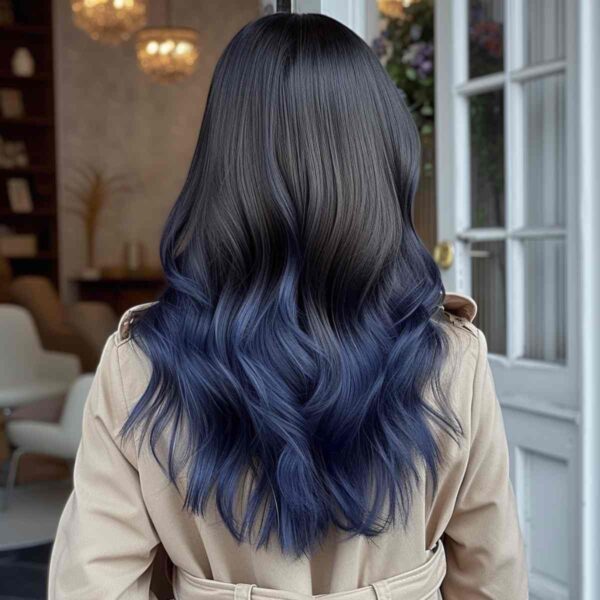 This hairstyle is chic and textured due to the color and layers. One of my favorite aspects of this look is the dark blue ombre that merges beautifully with the deep roots. Darker roots make regrowth less noticeable, resulting in lower maintenance. I suggest this for clients who have a formal office dress code, as this understated dark blue ombre is certainly not conspicuous in HR’s perspective.