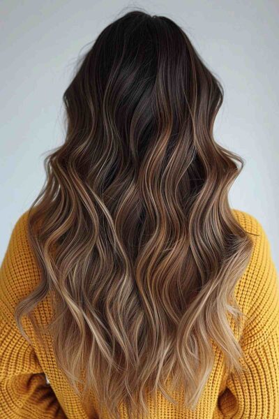 This look is a splash of creamer in a dark roast. The beauty of this color lies in how seamlessly it transitions from a deep base to lighter tips, and the dimension is something I adore! I would highly recommend this color to anyone seeking low maintenance. It’s ideal for individuals who enjoy styling their hair in various textured ways such as loose curls, waves, and braids, as it beautifully highlights the different shades.