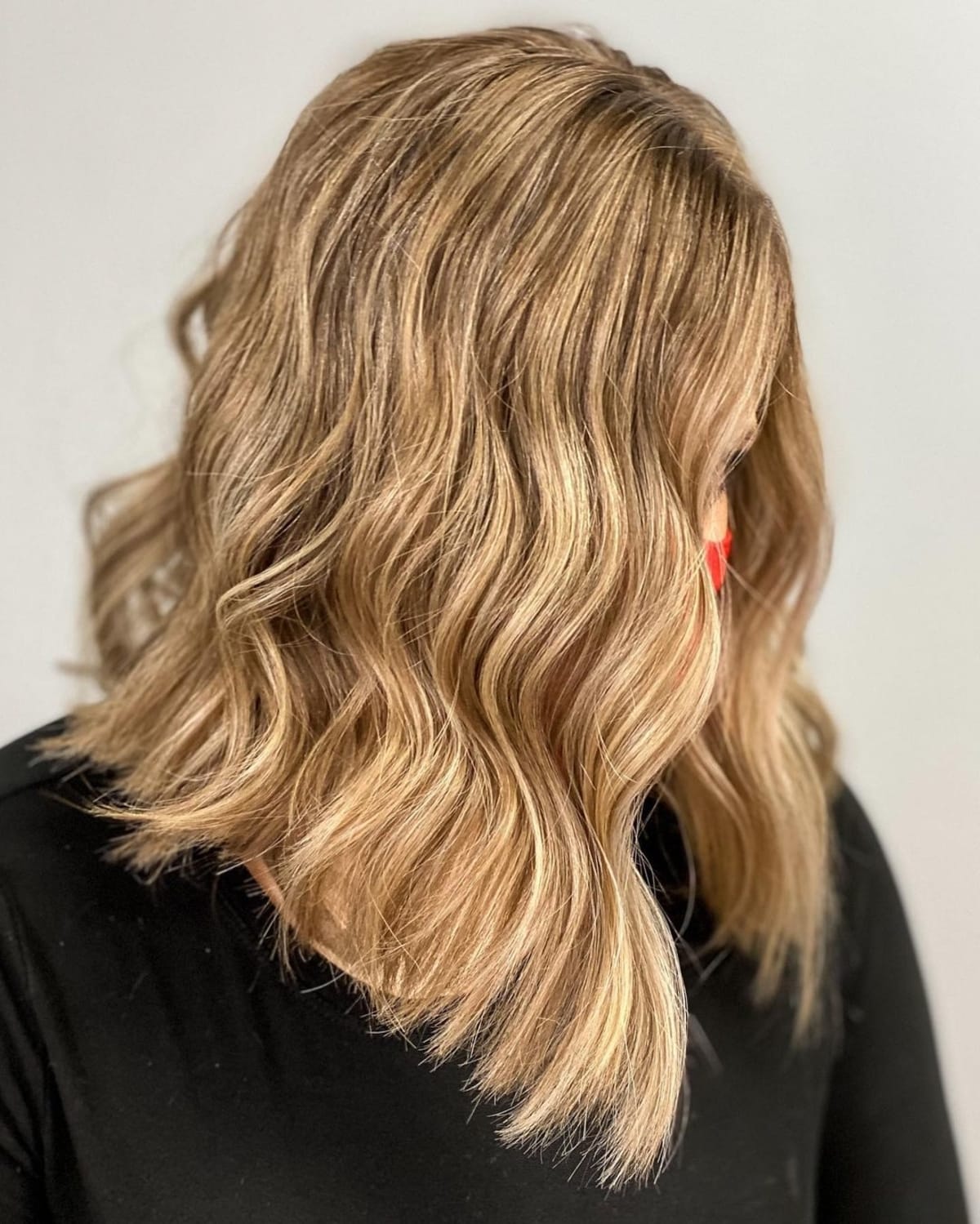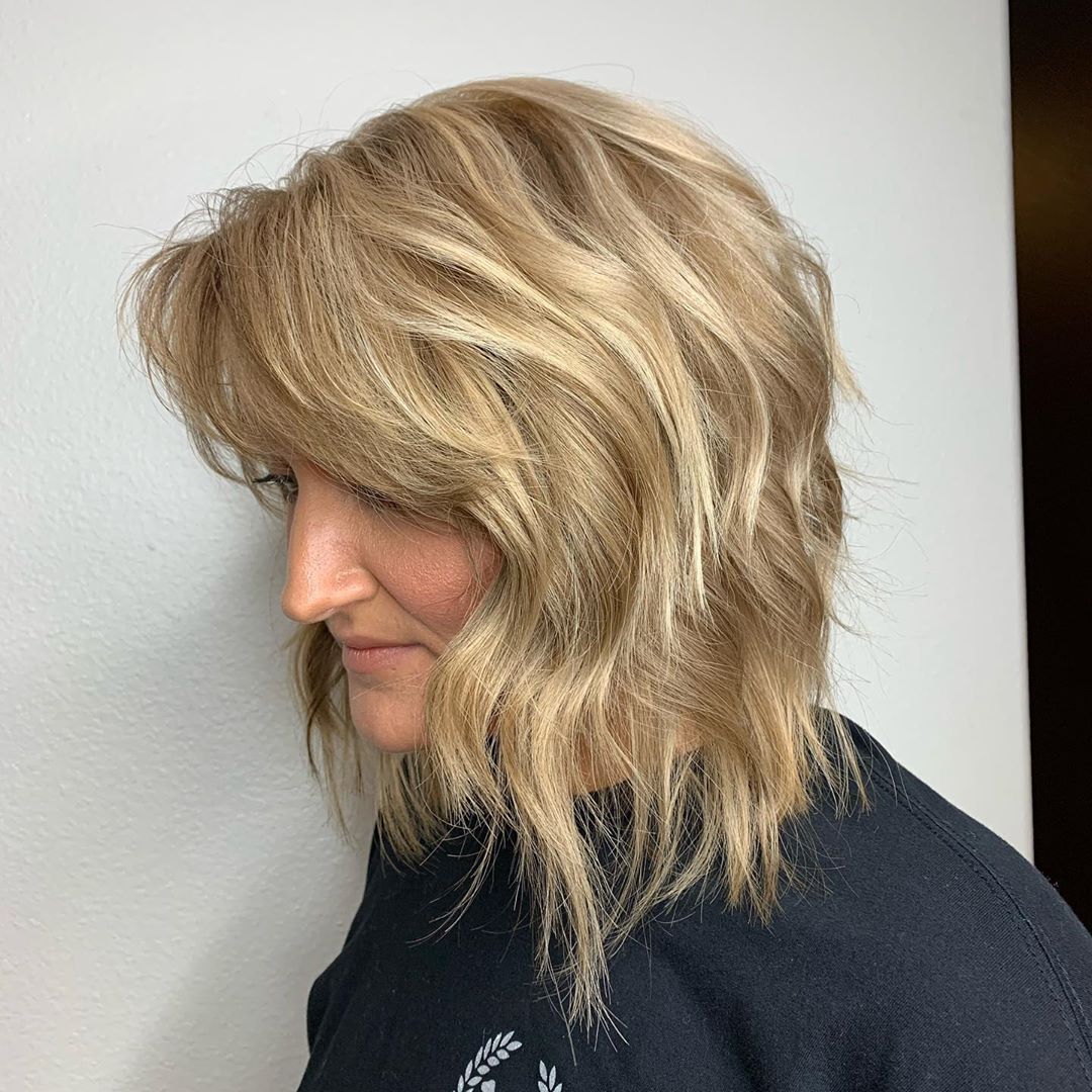 It’s the stylish medium-length inverted blonde bob that exudes elegance! You can style it however you wish, but you’ll always look great with soft beach waves. Request a blonde balayage for an effortless, tousled look that complements your fair skin tone.