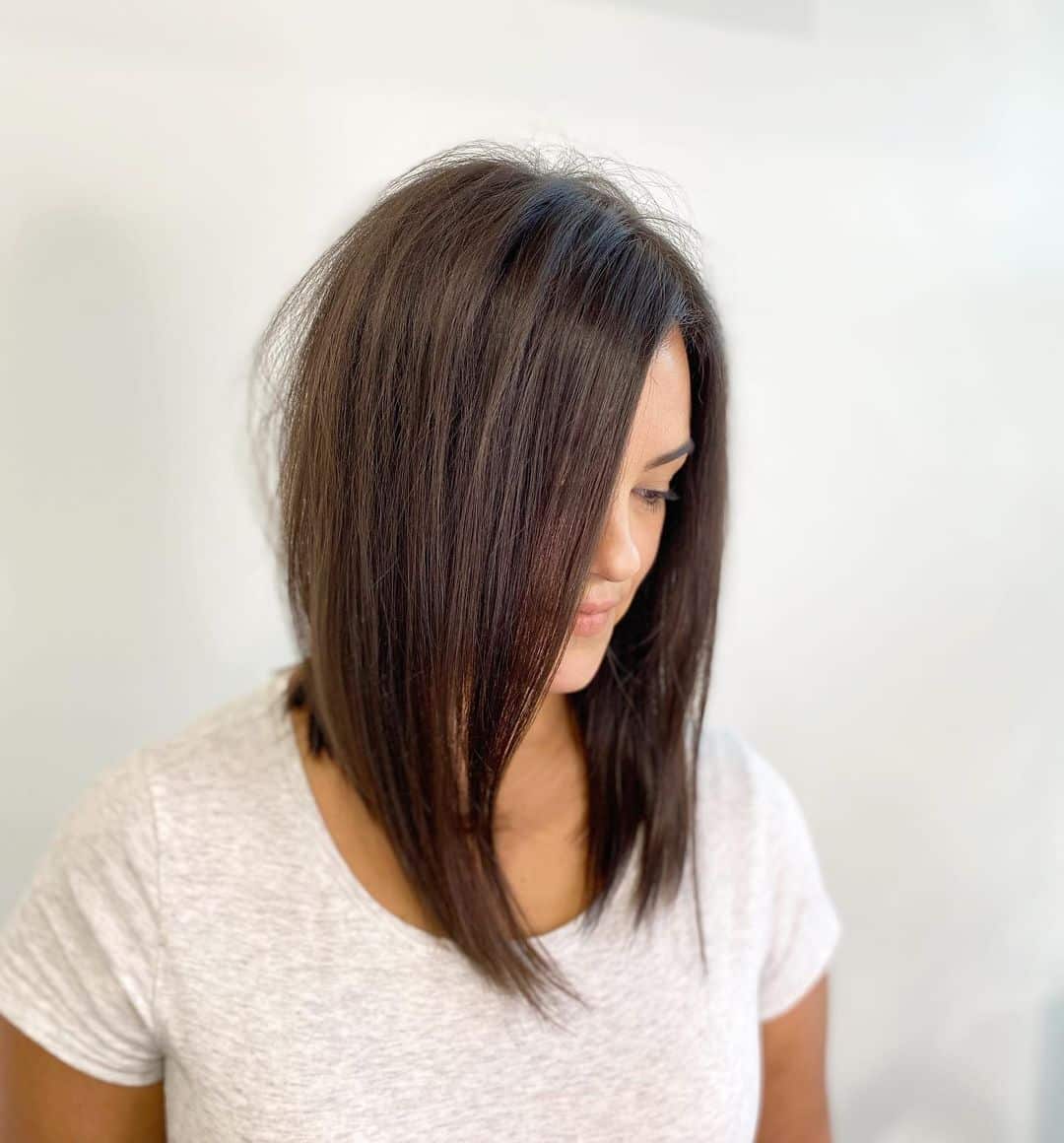 A sleek medium to long inverted stacked bob hairstyle is short at the back and gets longer at the front. This trend proves that growing out short hair should never be troubling. This inverted and stacked bob cut gives off a stylish and versatile vibe. You can style your long locks in the front with texture and waves today or flaunt it with your natural straight hair the next day.
