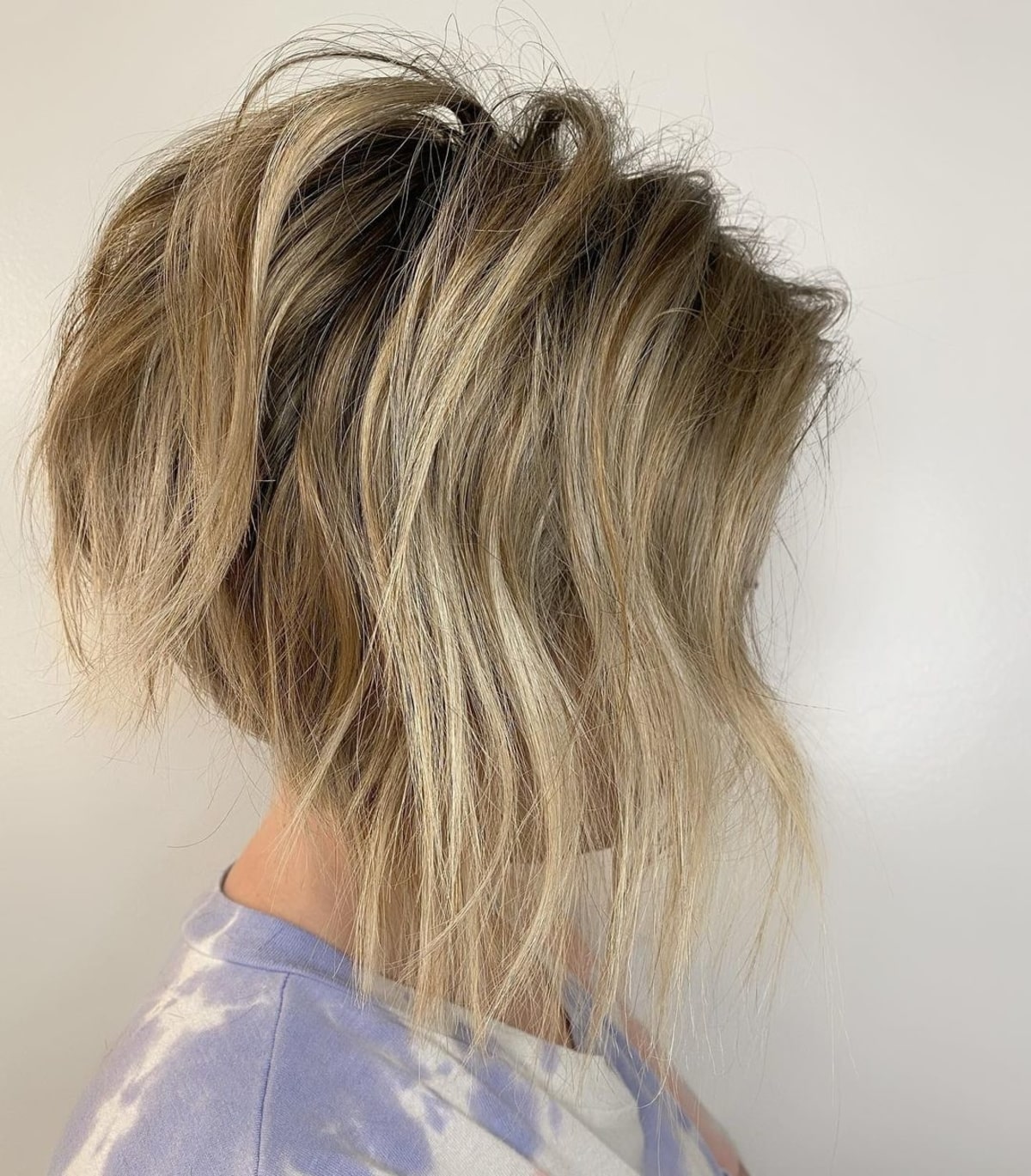 Opting for a shaggy bob for fine hair is a fantastic choice. This inverted bob with layers introduces movement and volume to your strands. Shags combined with inverted bob haircuts like this enhance texture to mid-length hair, beautifully complementing soft waves. If you desire an additional wow factor, an ombre or a deep-rooted balayage is the perfect solution.