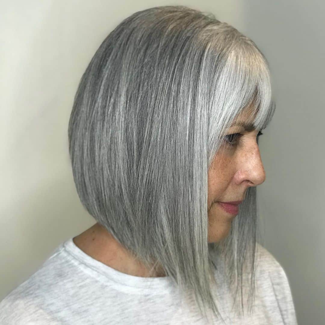 Chic medium inverted bobs for women over 50 should feature abundant texture and front layers to suit naturally grey-thinning hair. For a more vibrant appearance, think about incorporating choppy bangs.