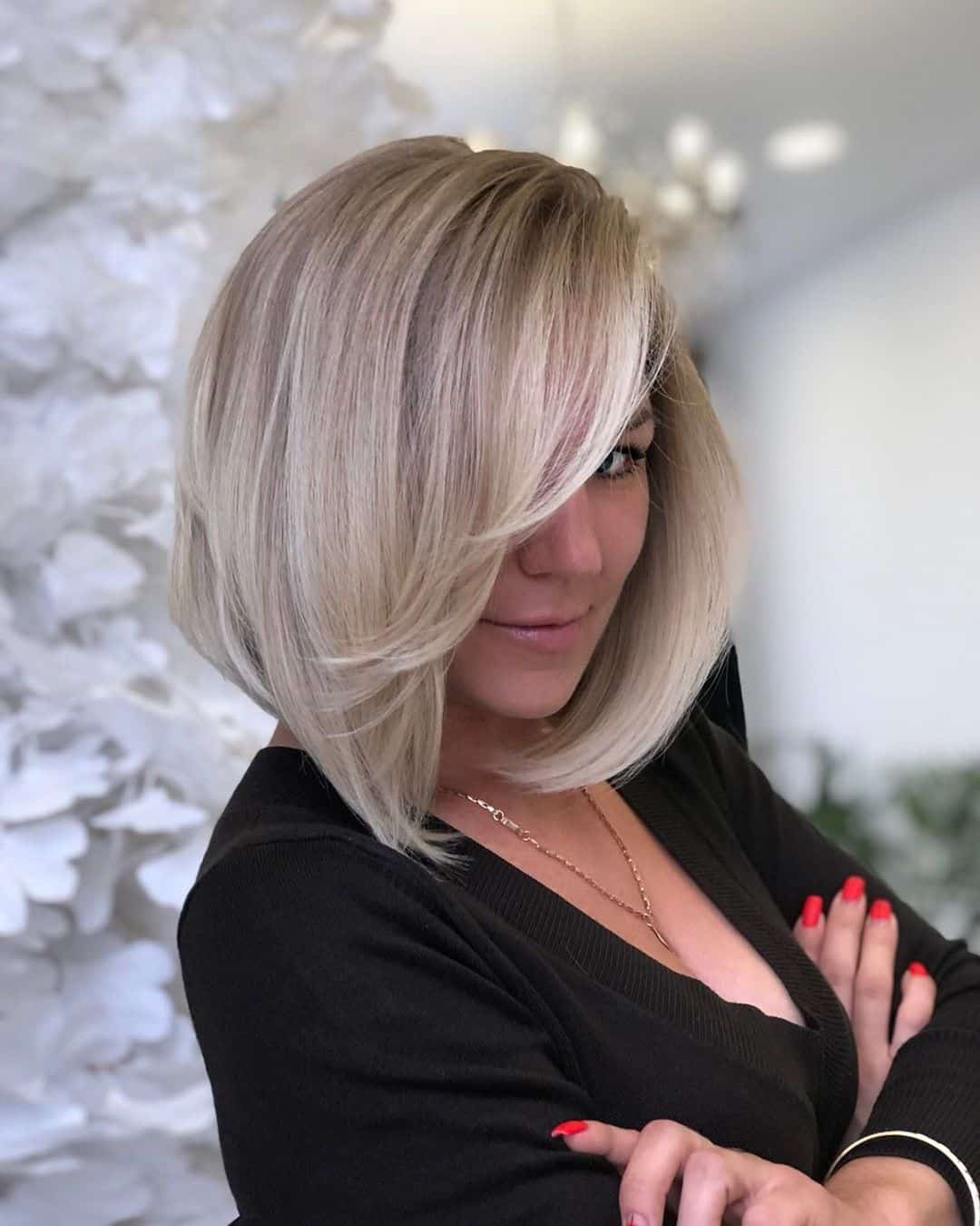 This stylish medium-length inverted bob with side bangs offers a perfect blend of volume and allure. Use a round brush along with a blow dryer to recreate this sought-after appearance. Additionally, the dark-rooted platinum blonde hue will undoubtedly enhance your facial features.