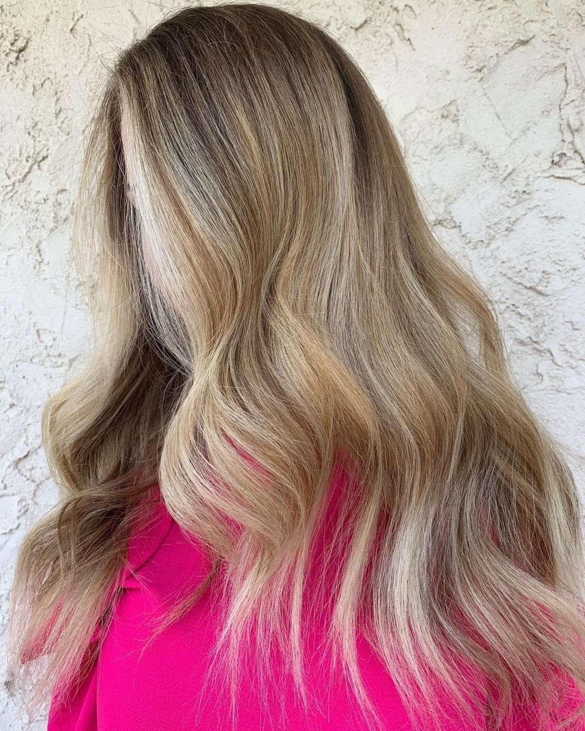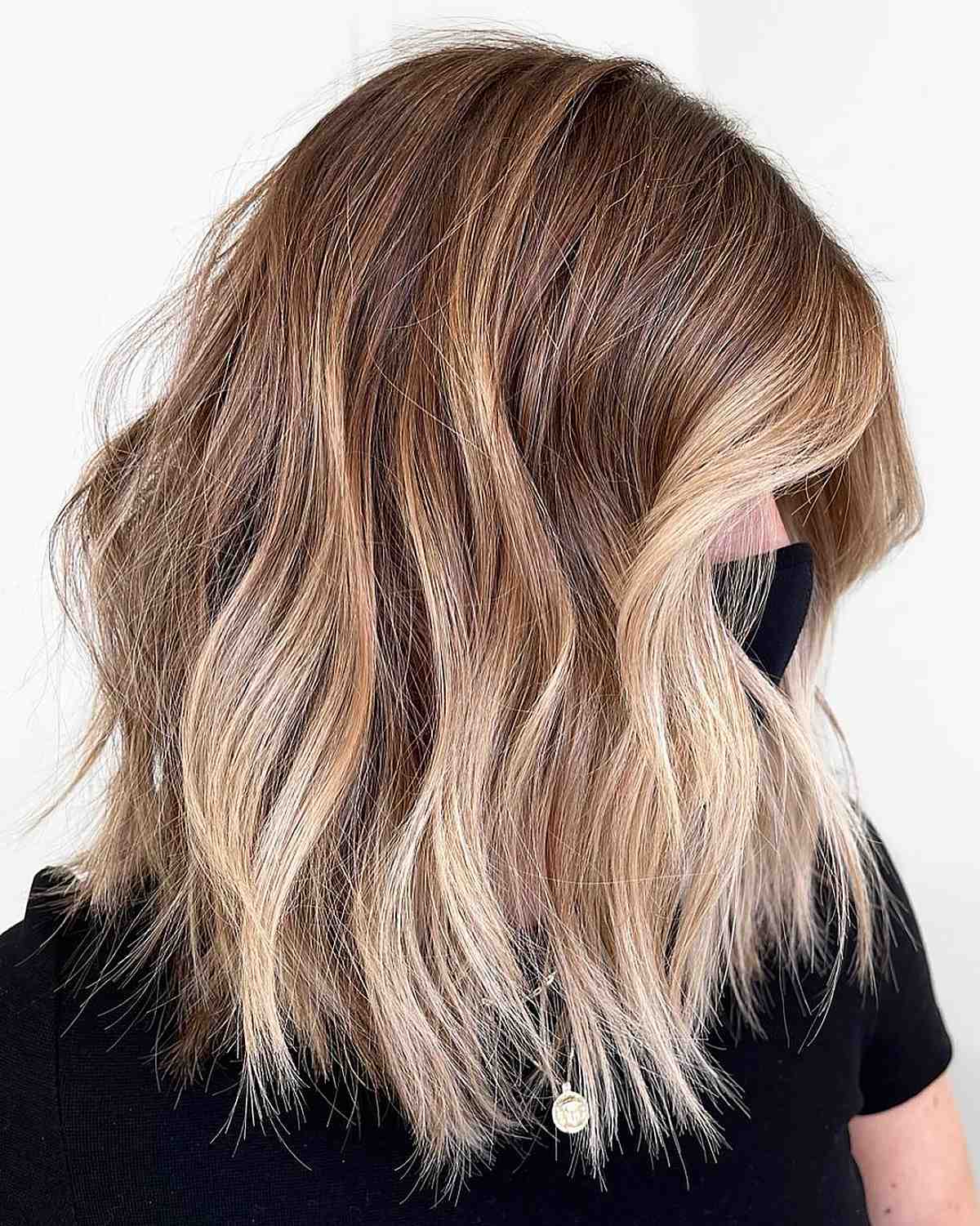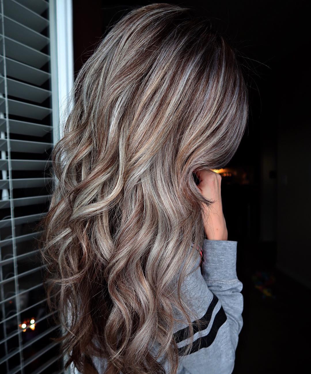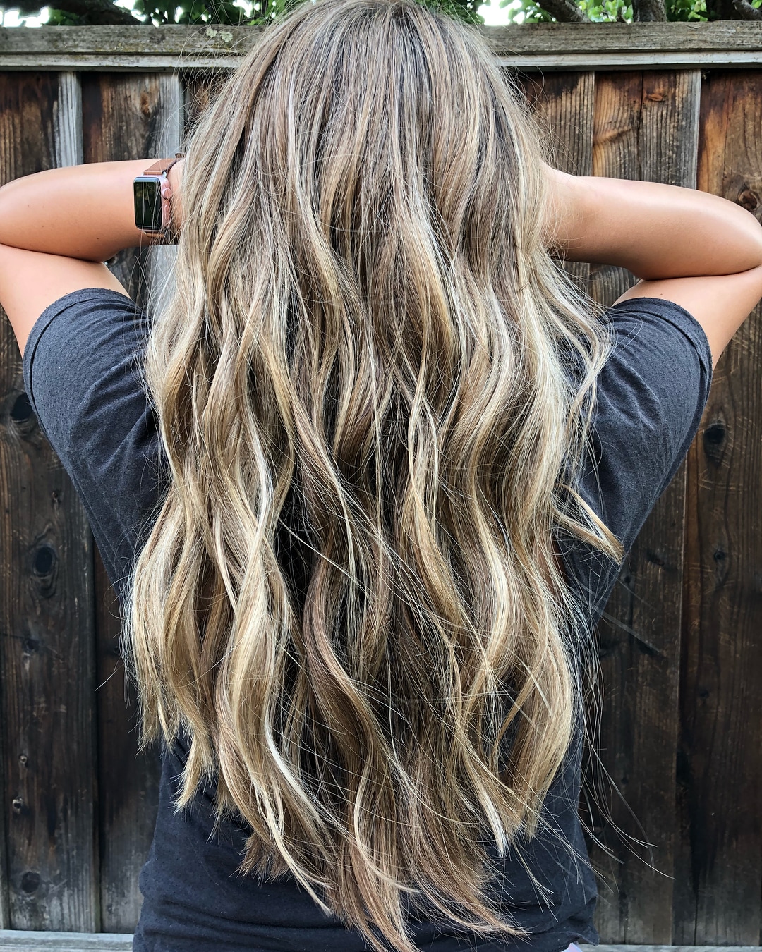 This wavy hairstyle is a classic ash bronde balayage with blonde tones and darker roots.