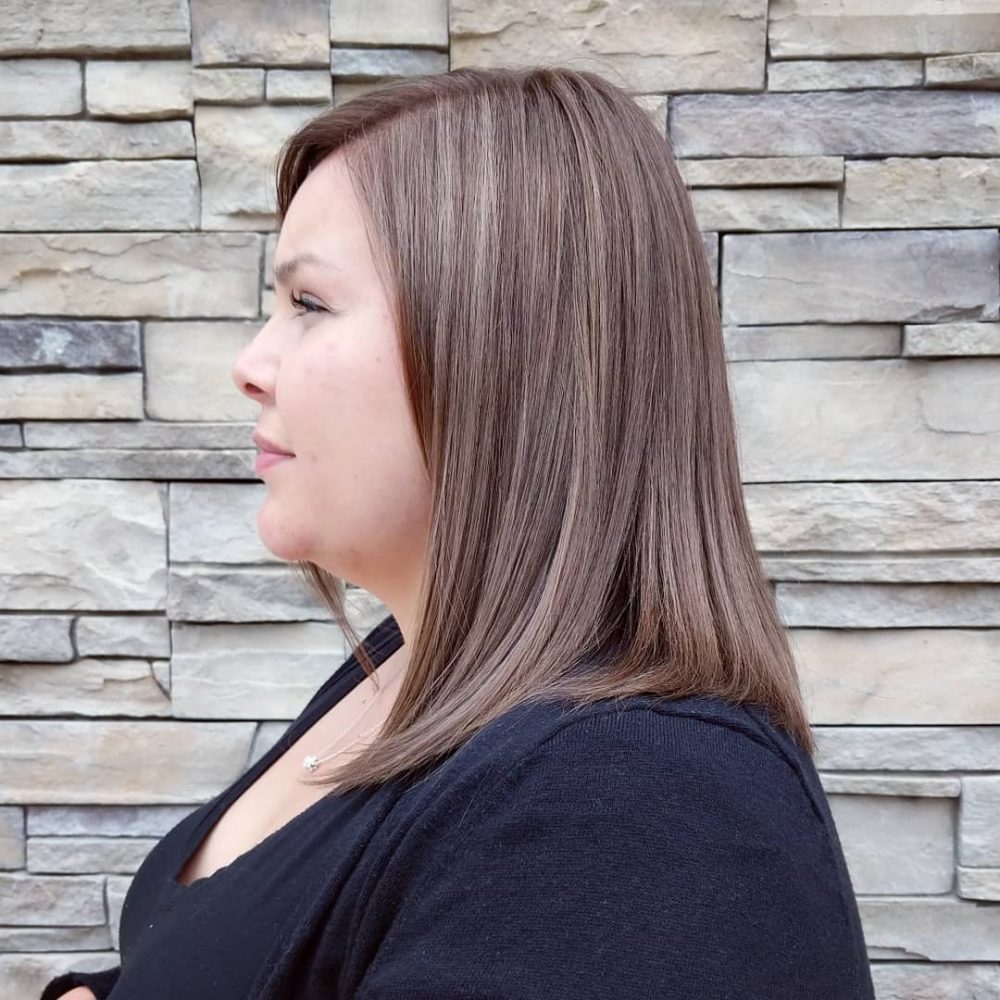 The dimension in this ashy brown hair with fine highlights works beautifully on a sleek and straight texture.