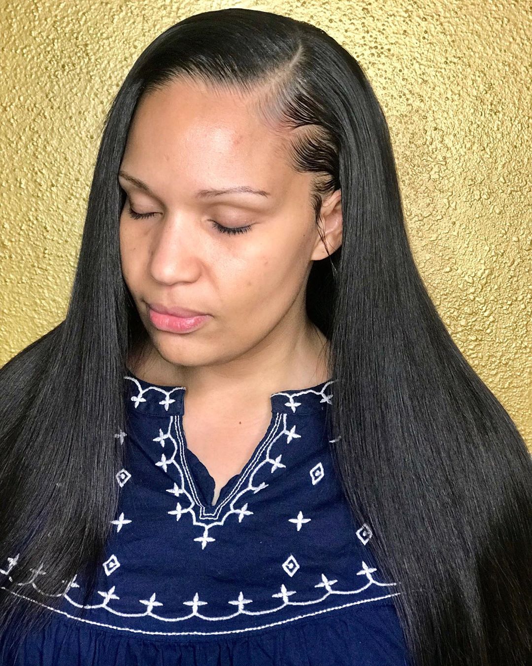 It’s impossible not to exude confidence when wearing this long, sleek sew-in style. There’s always a soft spot in every lady’s heart for a middle-parted trend, too. It beautifully frames the face without needing to chop off some curtain bangs or add a money piece. It’s considered a protective hairstyle, meaning the client’s real hair is shampooed, conditioned, blow-dried, and braided down underneath the weave.