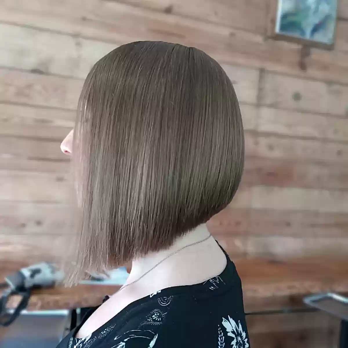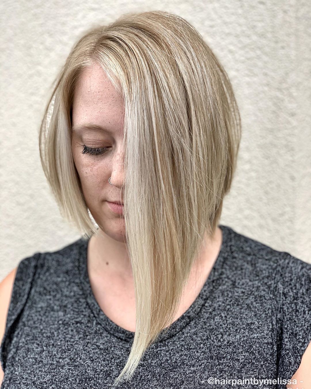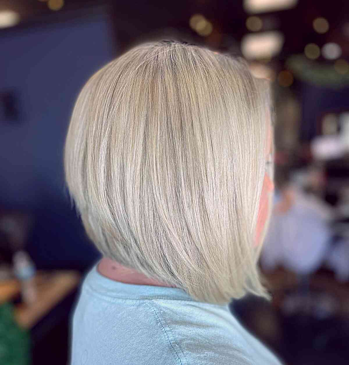 This stylish angled bob features exquisite layering and volume. The textured layers create a lively and fashionable appearance. Maintaining this beautiful blonde shade at home is simple; just use a purple shampoo to neutralize any unwanted yellow tones.