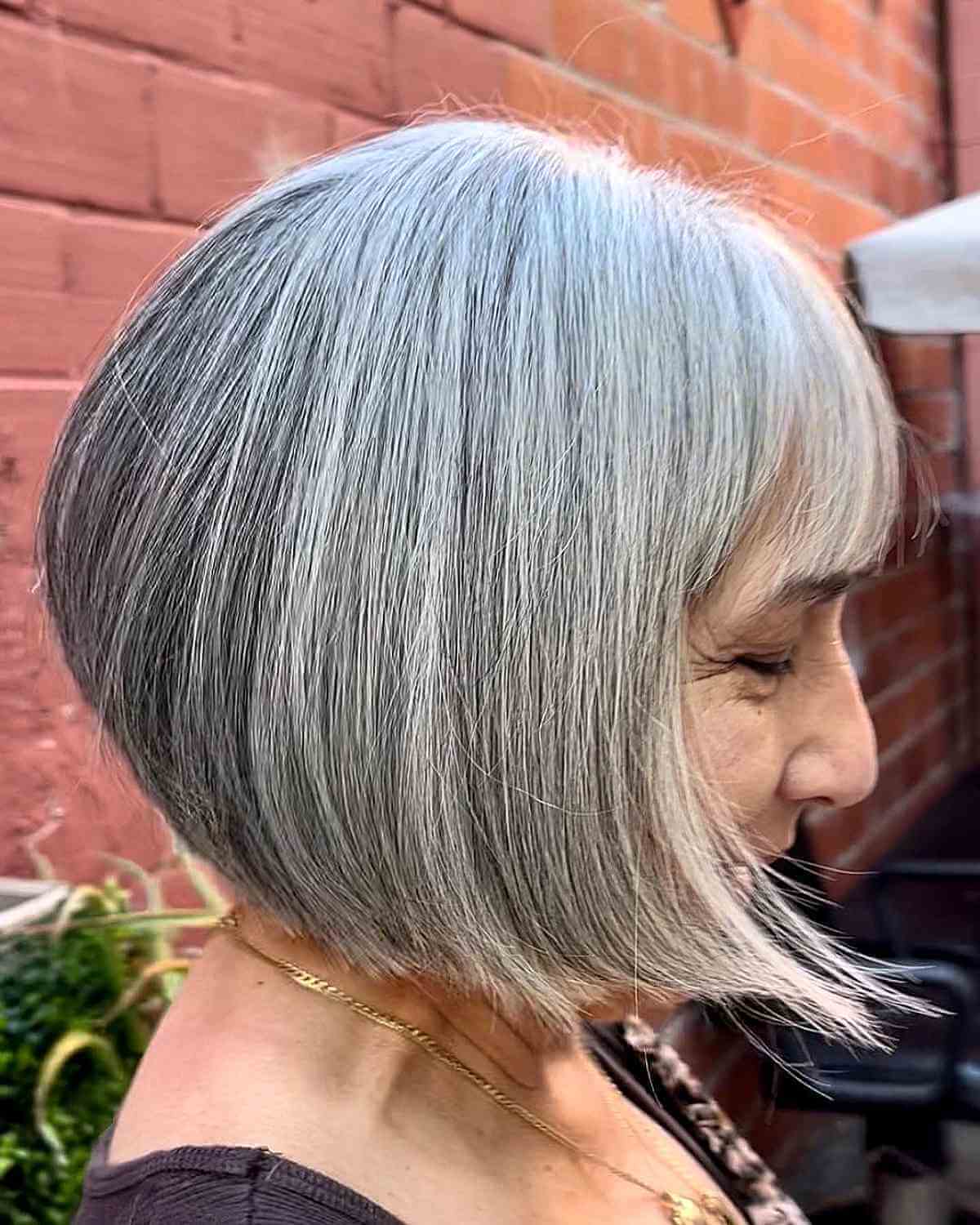 A chic grey swing bob with bangs is one of the most stylish sleek options. This swing bob hairstyle appears fabulous with textured ends to soften the bluntness.