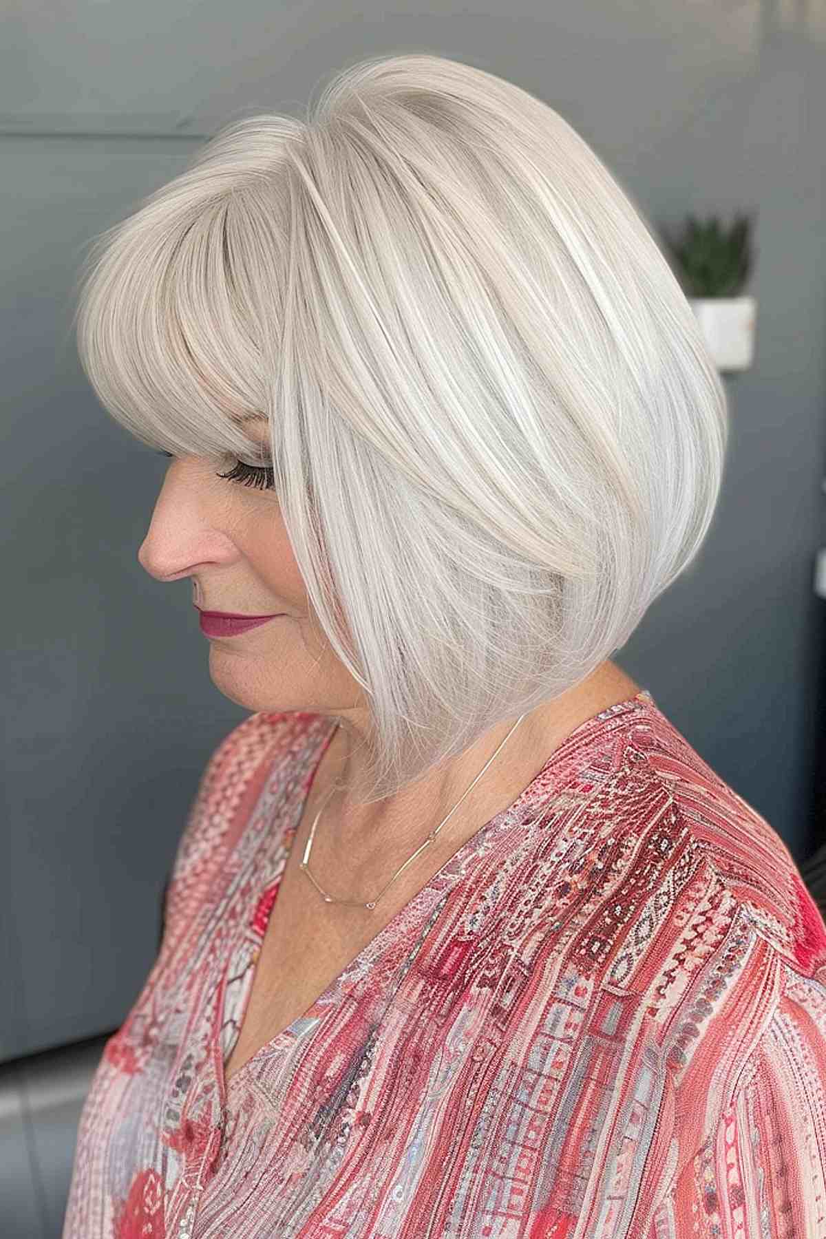 This stylish layered swing bob with bangs is perfect for women over 60. The soft layers add volume and movement to fine to medium-density hair, while the fringe beautifully frames the face, enhancing the eyes. The A-line cut offers a contemporary touch, and the silver shade elevates the overall elegance. Ideal for oval and heart-shaped faces, this style is easy to maintain with regular trims to keep the shape sharp.