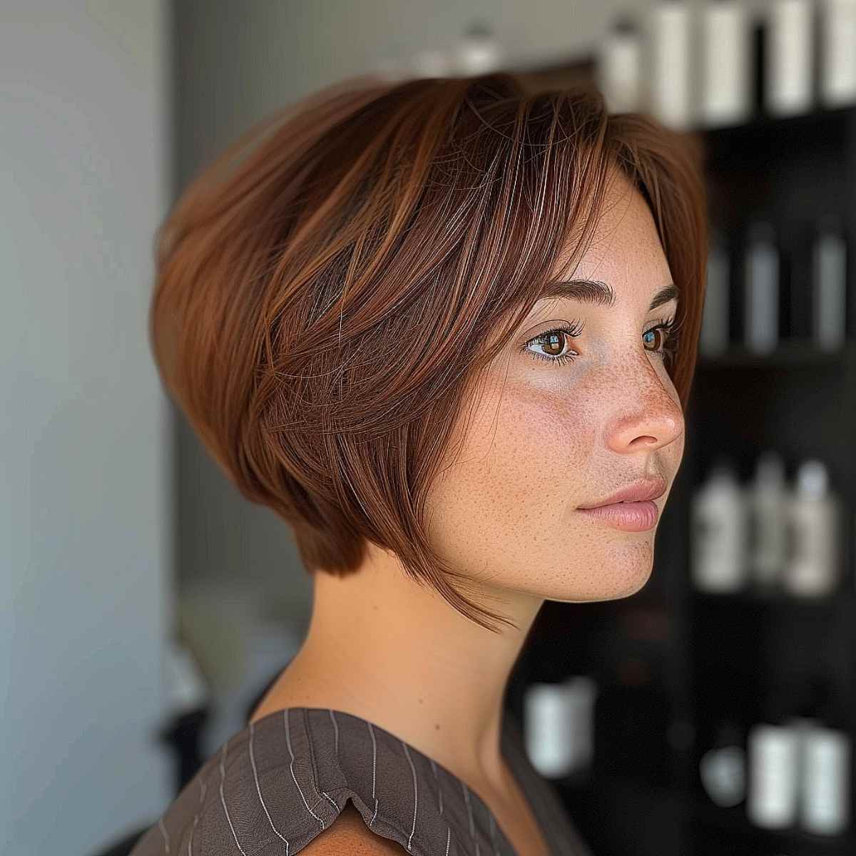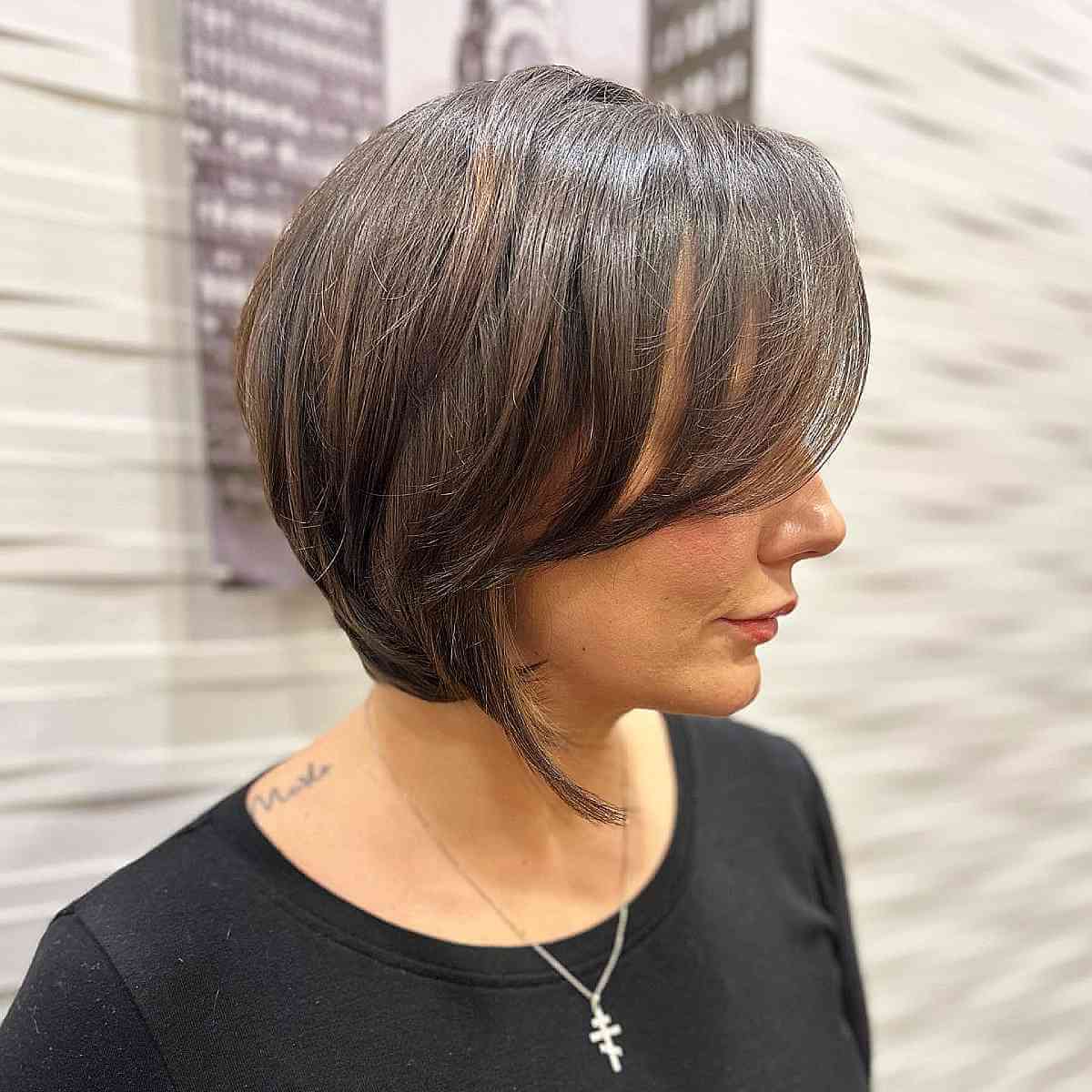 Choosing a stylish, short, stacked swing bob with side bangs is the ideal option when your fine hair requires definition. By selecting the right color for short bobs for women, you can blend dark locks with subtle warm, light brown highlights for a chic appearance that stands out.