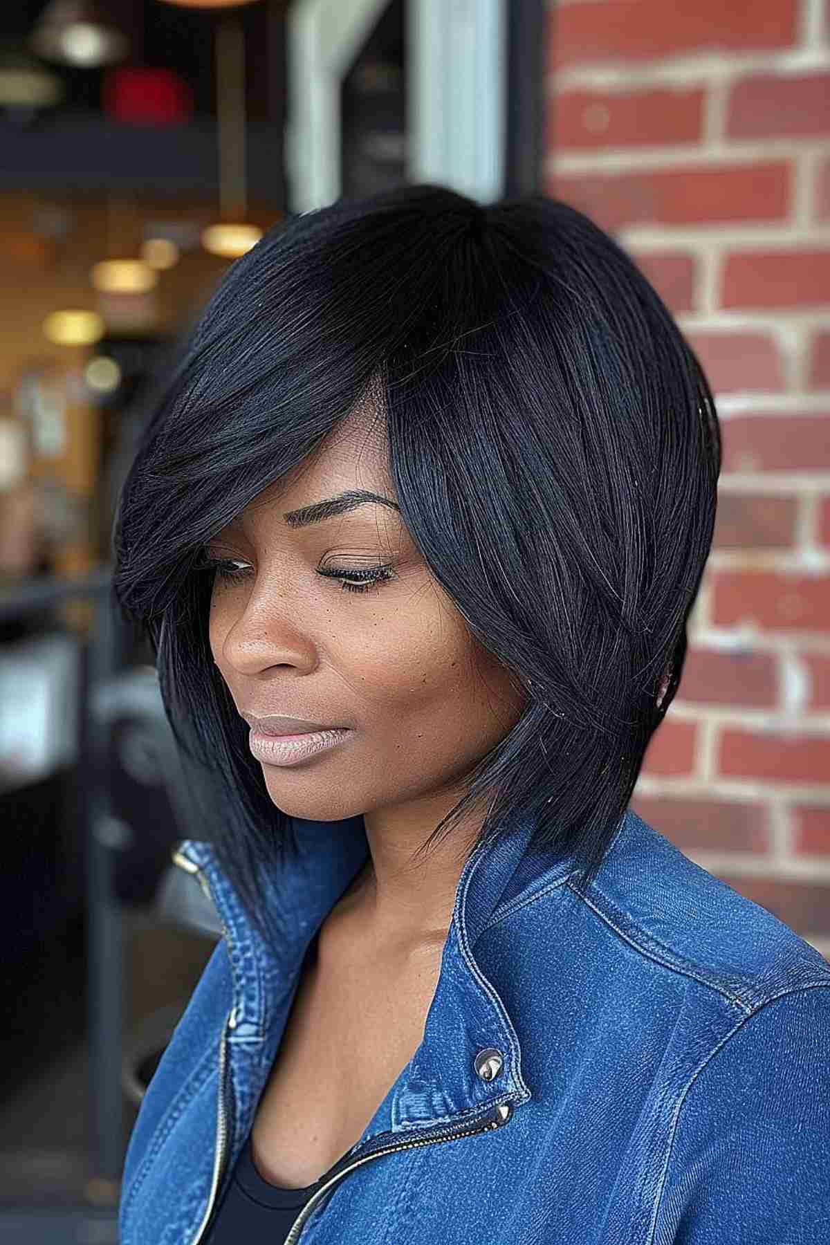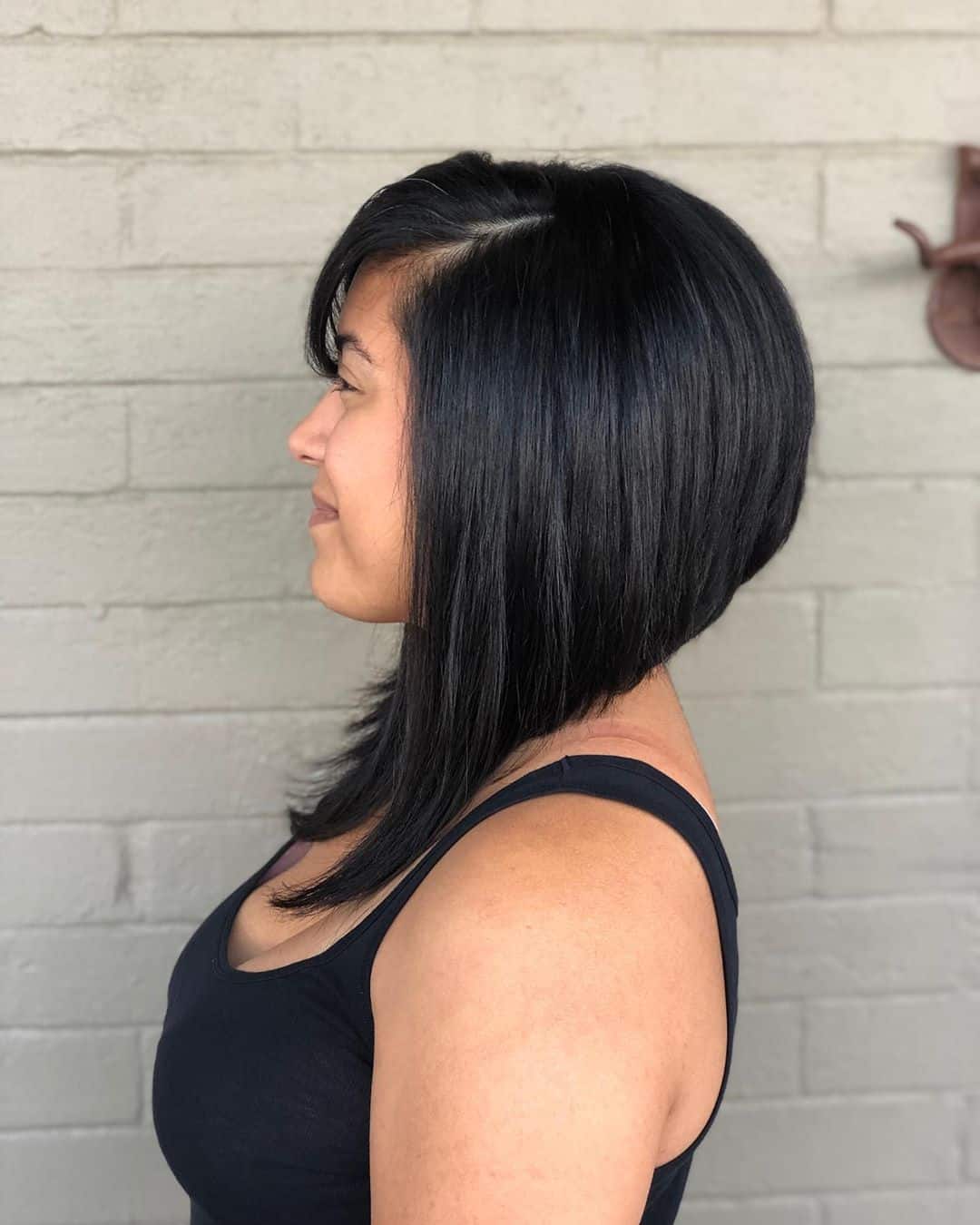 This elegant swing bob for black hair starts short in the back, gradually grows longer towards the front, and is crafted with meticulous precision. Parting the dark tresses will reveal how stunning this looks on you.