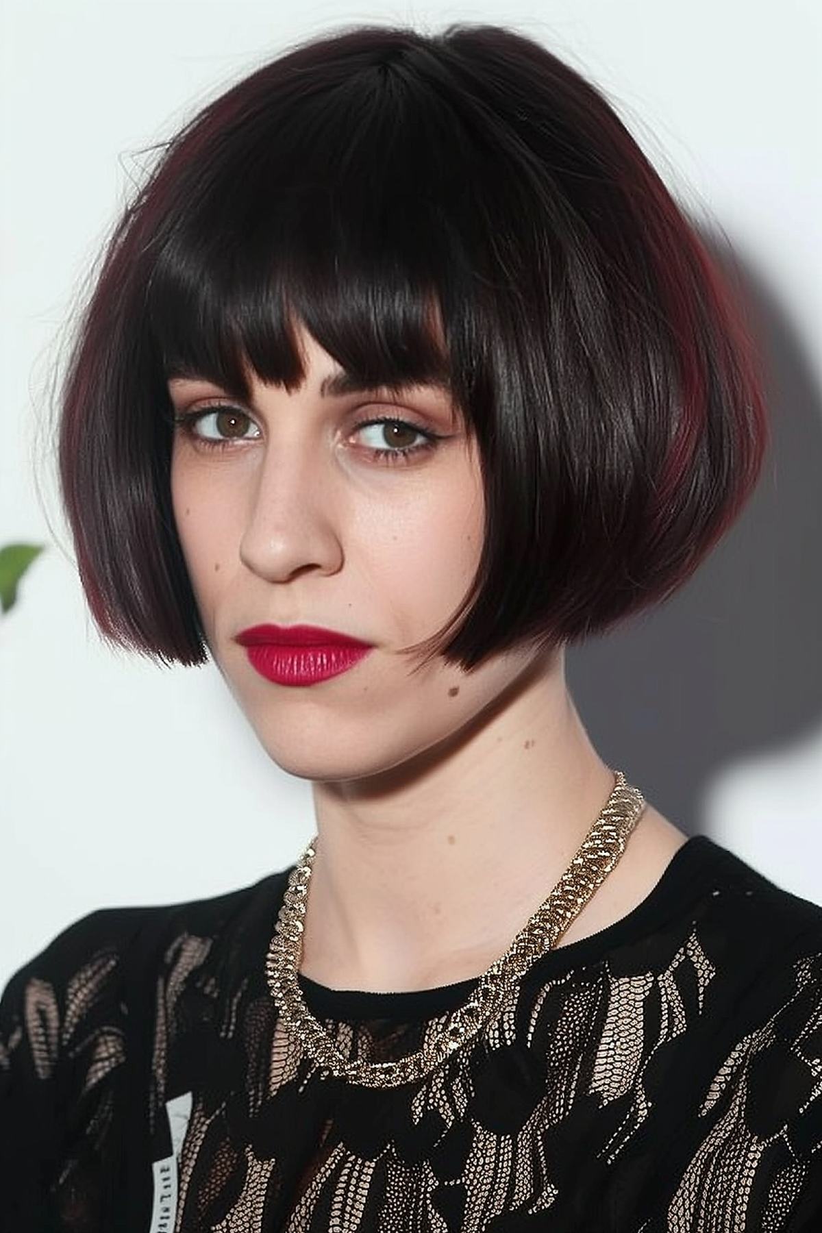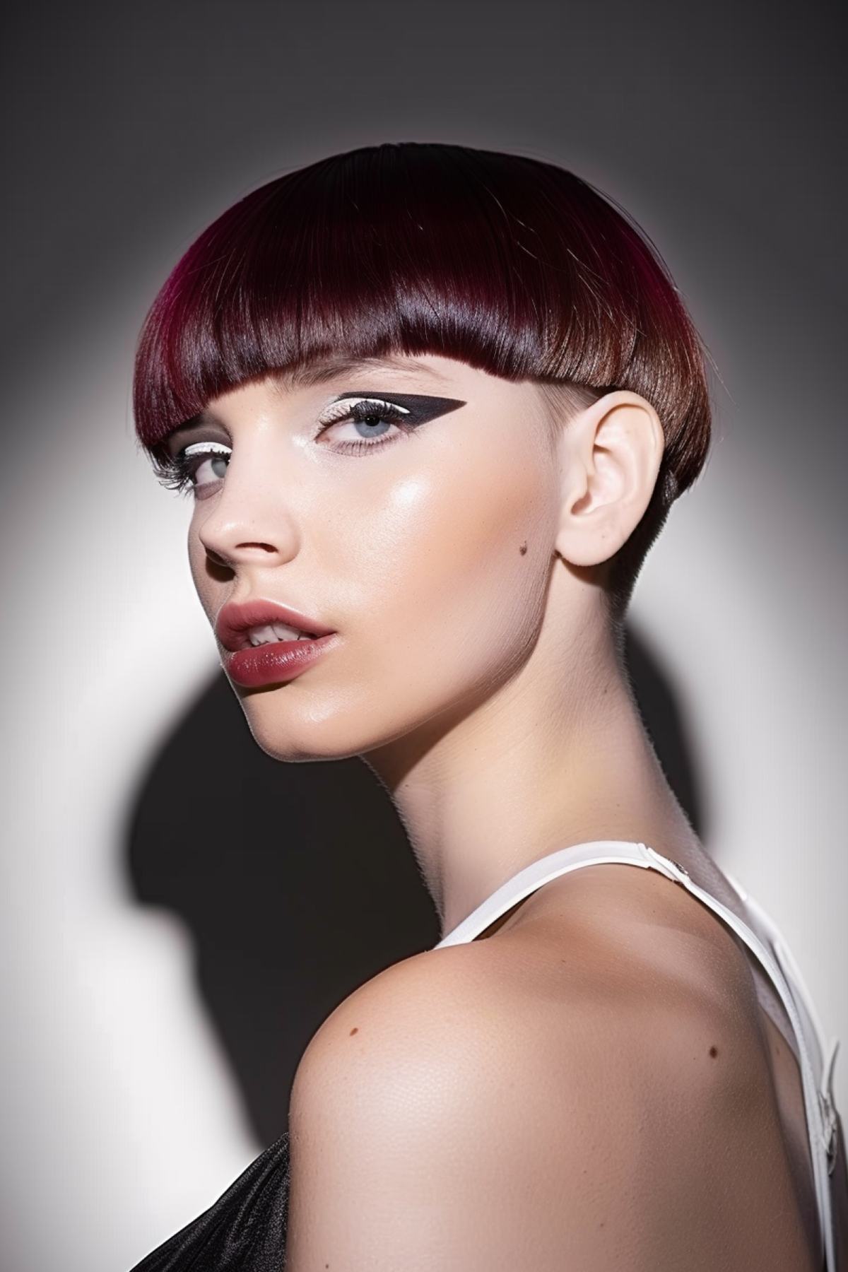 This contemporary take on the bowl cut melds classic elegance with a hint of vibrancy. The bob length ends right at the jawline, flattering a variety of face shapes. The uniform fringe beautifully frames the face, drawing focus to the eyes. The distinctive element here is the burgundy hue subtly emerging from the dark brunette base, lending richness and a playful twist to the look.