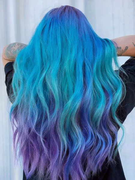 This is an aqua blue to magenta color transition. These colors together, while on the deeper side, are still very rich. You must be willing to maintain the proper way so the color will last as long as possible, such as washing with cold water and using color-safe products. Like anything else we do for ourselves, hair comes with a commitment.