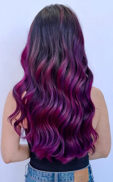 This dark-to-vibrant purple ombre hair color is playful and trendy. Playing with bold colors on a deep base makes the rich hue stand out! If placement is on point, you can rock this look straight or curled, but I adore when texture highlights the contrast.