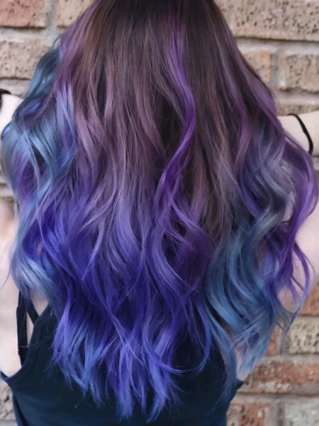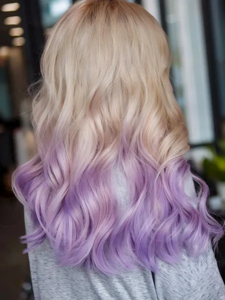 Creating a beautiful purple ombre hair color offers endless possibilities. Blondes can maintain their bright hue by incorporating a shadow root, which helps make regrowth appear more natural. The combination of purple ombré with lavender adds rich dimension to the hair.