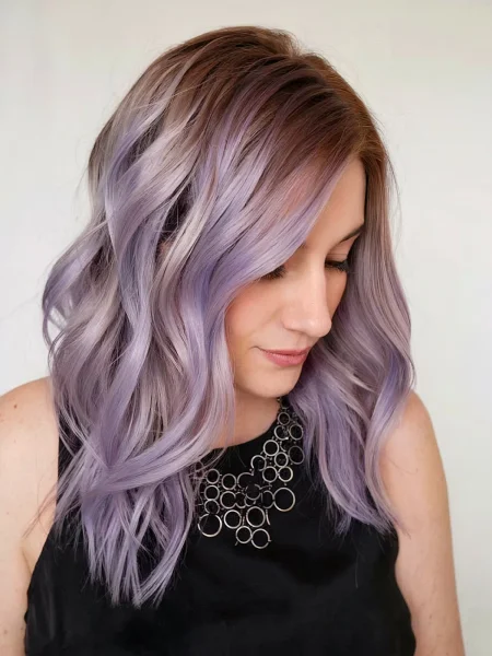 Here’s a suggestion for brunettes to explore fresh and vibrant hair colors: blonde and purple hair with deep roots. Ideal for a relaxed day style, scrunch the ends of your beautiful lavender ombre to create this effortless beach wave effect.
