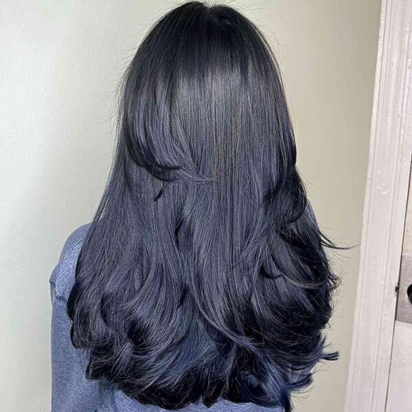These dark navy blue tresses have incredible movement thanks to the layered haircut. If you aim to achieve a richer blue hairstyle, utilize a curling iron to form soft beachy waves. Opt for a premium coloring product like Joico when looking for a black hair dye to achieve a blue-black hair color similar to this navy shade.