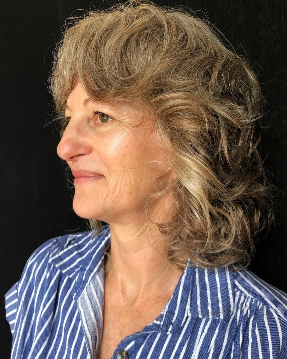 An effortless shoulder-length shag for curly-haired older women works for all hair types from thick to fine. Keeping the hair cropped close to the head is super cute and funky. Older women with edgy haircuts featuring fringe just above the brow, set off the eyes and open up the face. If you have naturally straight hair, styling it with waves or a curl will do wonders!
