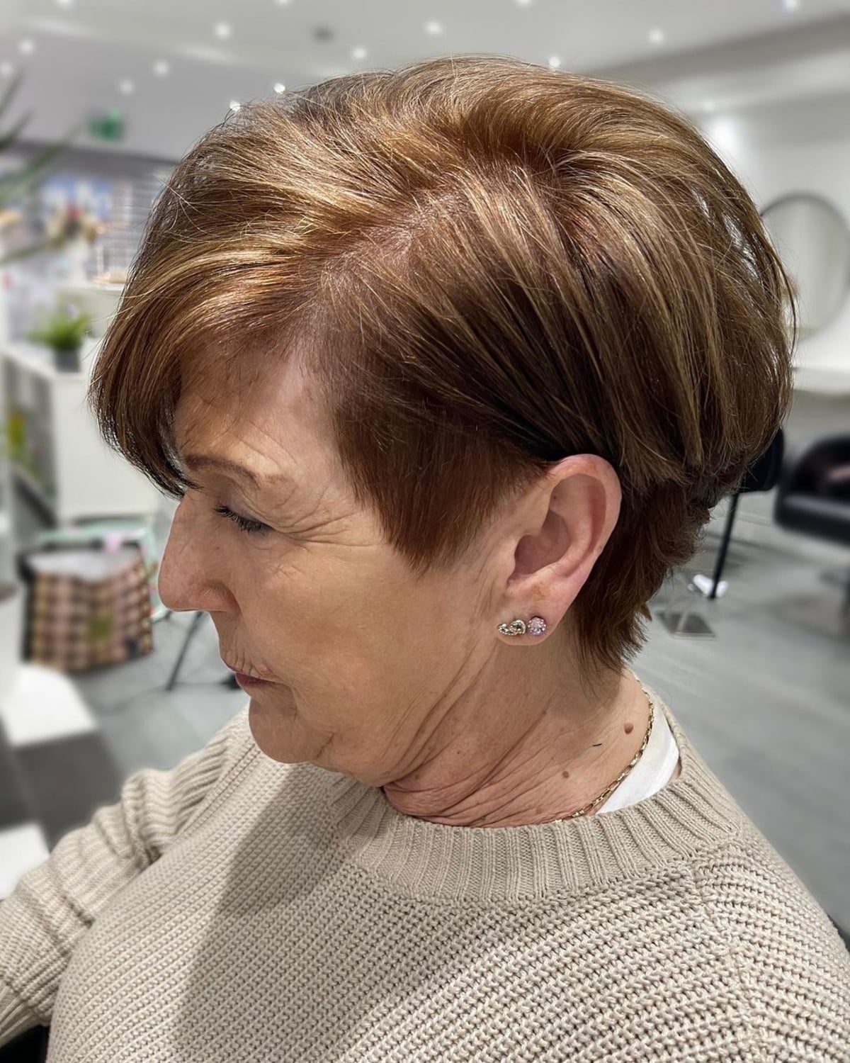 Choose a stylish pixie bob for senior women! Embrace uniqueness with trendy styles for older women by keeping the back cropped nicely short, transforming it into a more rounded bob. A pixie haircut is flexible as it can be styled wild and piecey or elegantly smooth. Utilize a root boost volumizer for enhanced lift and volume.