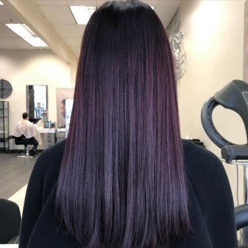 A deep purple shade on dark locks appears soft when indoors but offers your hair a vibrant burst of color in sunlight. This look is perfect for women seeking a playful, more striking hue. Touch-ups are recommended every 6-8 weeks. Additionally, it’s best to wash with cold water, as this helps preserve the color. You may also consider using color depositing shampoo or conditioner to rejuvenate your hue.