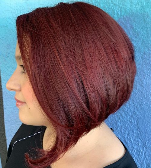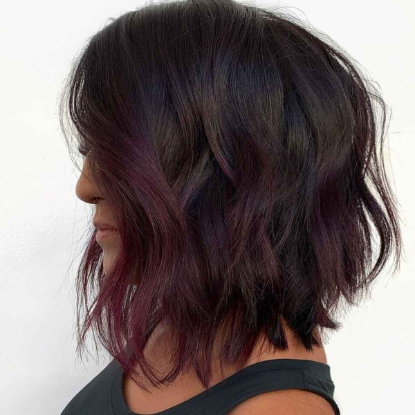A deep purple plum bob has a color that complements fair and pale skin tones. The richness of the dark purple shade makes your skin look flawless, though the streaks are very subtle. They add more texture to your hair color and accentuate layers on a short haircut. This deep purple plum tint on a bob cut is trendy and edgy. This bob is amazing, with medium to thick hair with a natural texture. It’s asymmetrical and perfect for a round face shape, too.