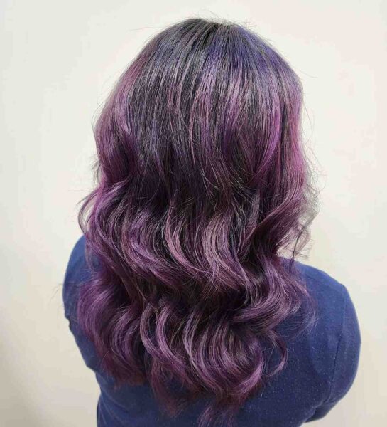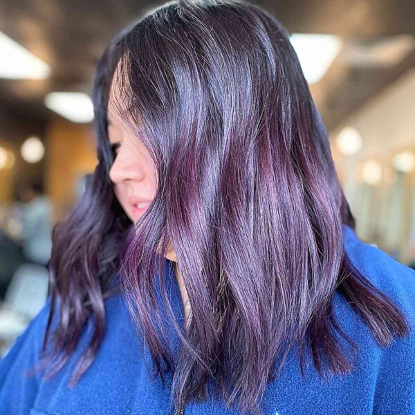 This is a blackberry color balayage with a dark hue at the roots and striking purple tones from mid-lengths to ends. It has a brown base with Jack Winn Pro Color blended into a custom mix of Pulp Riot deep purple hues over pre-lightened hair. This purple-black hairstyle features long layers for the cut. With this type of color, your hair will also need to be lightened to achieve the vibrancy of the purple, so they typically take around 4-5 hours for the initial service.