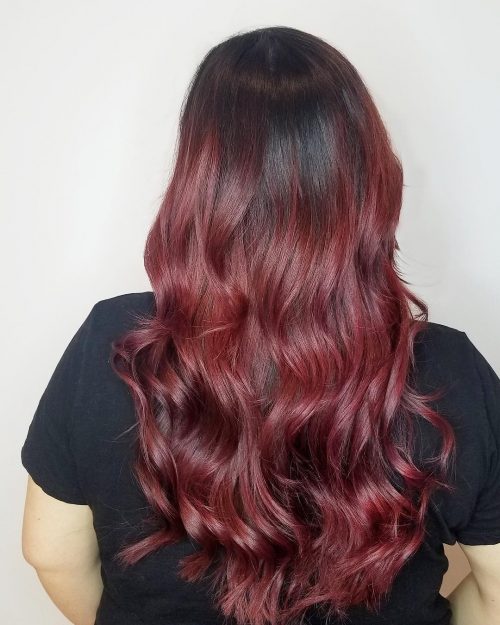 Pull off red to dark purple ombre hair and showcase a distinctive color melt. To achieve such beauty, your roots must be darker. That way, both mid-lengths and ends get a brighter result. Trendy hair color like this is best when paired with a long haircut. This purple hair with dark roots would look fabulous with waves for a seamless effect of tones.