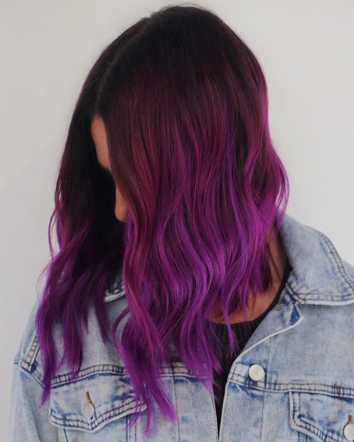 Dark roots that transition to a rich purple hair dye at the tips create a dreamy finish to a classic lob.