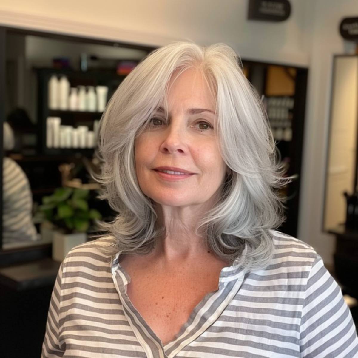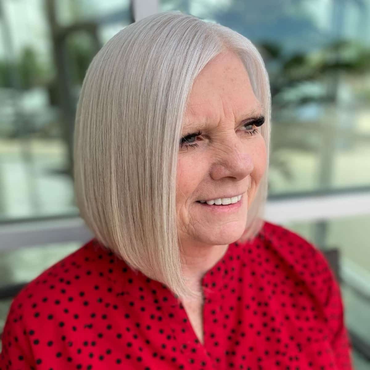 A chic silver graduated bob for women over 60 with fine hair is an ideal cut that provides added volume and conceals any possible hair thinning. The shorter length at the back ensures a refreshing breeze on the neck. The length around the front softly frames the face, adding a touch of femininity.