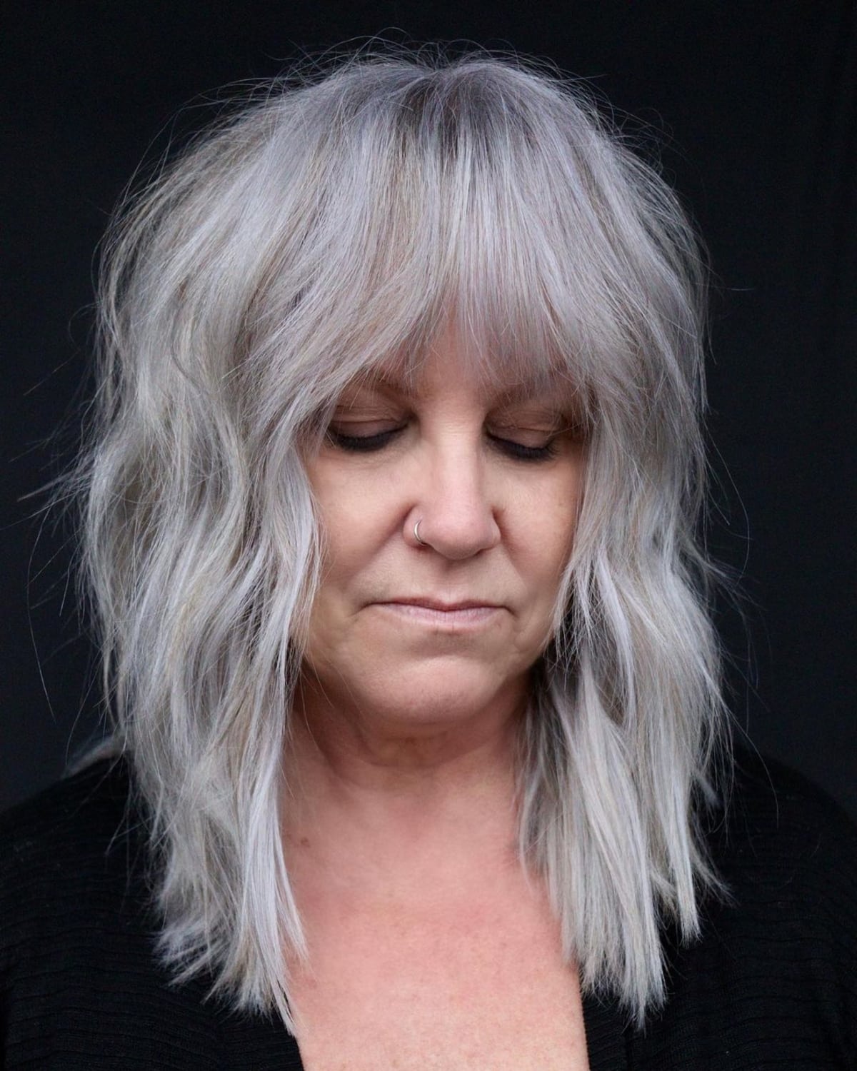 A bold and chic shag cut features plenty of texture, framing layers, and short crown layers for added volume. Incorporate side-swept bangs just above the eye to enhance the cut. Ideal for women in their sixties who desire a shorter style that’s effortless to maintain. Plus, it will help you appear a decade younger!