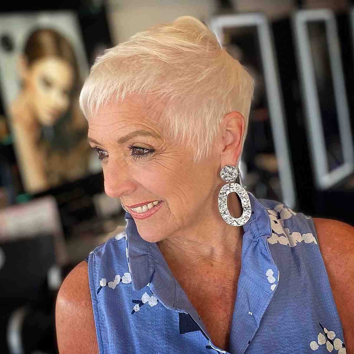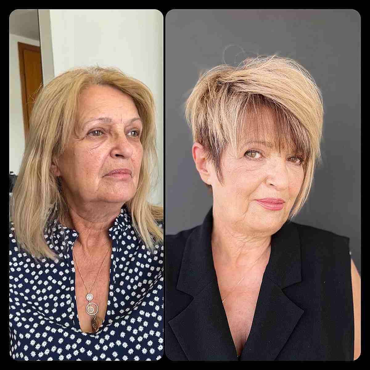 A fringe-enhanced side-swept pixie is a fantastic hairstyle that continues to gain popularity. A pixie with bangs offers a bold change that is perfect for women over 60 who are looking for a fresh style. To add more edge to a pixie, style it with texture and loose waves for an effortlessly tousled appearance.