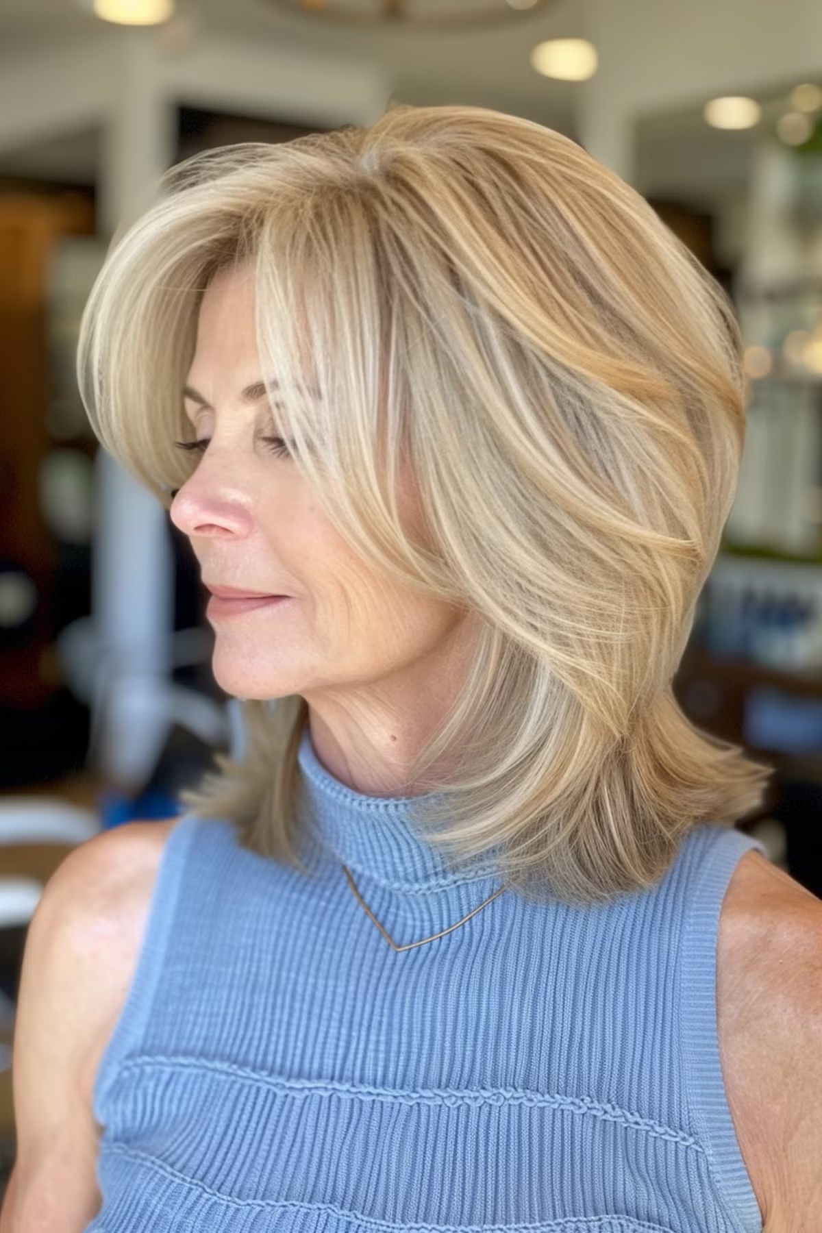 A textured lob with luminous highlights is a striking hairstyle. A shag is ideal for mature women as it features numerous uneven, soft layers that create an illusion of added volume. To incorporate natural grays, adding blonde highlights is the best approach.