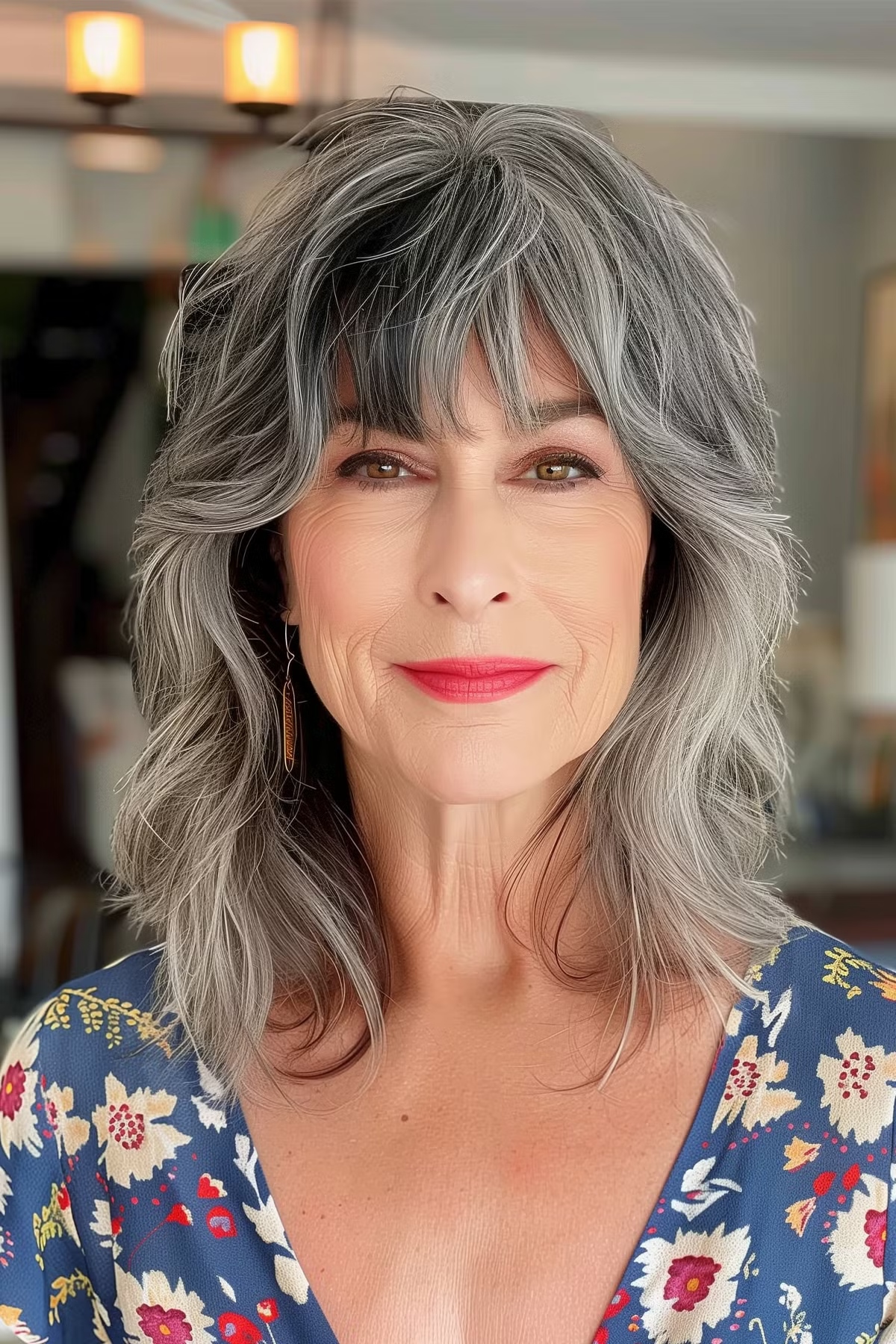 With a contemporary twist on a shaggy mullet, the wolf haircut is a bold choice. If you’re in your sixties and have longer hair, consider a wolf haircut style.