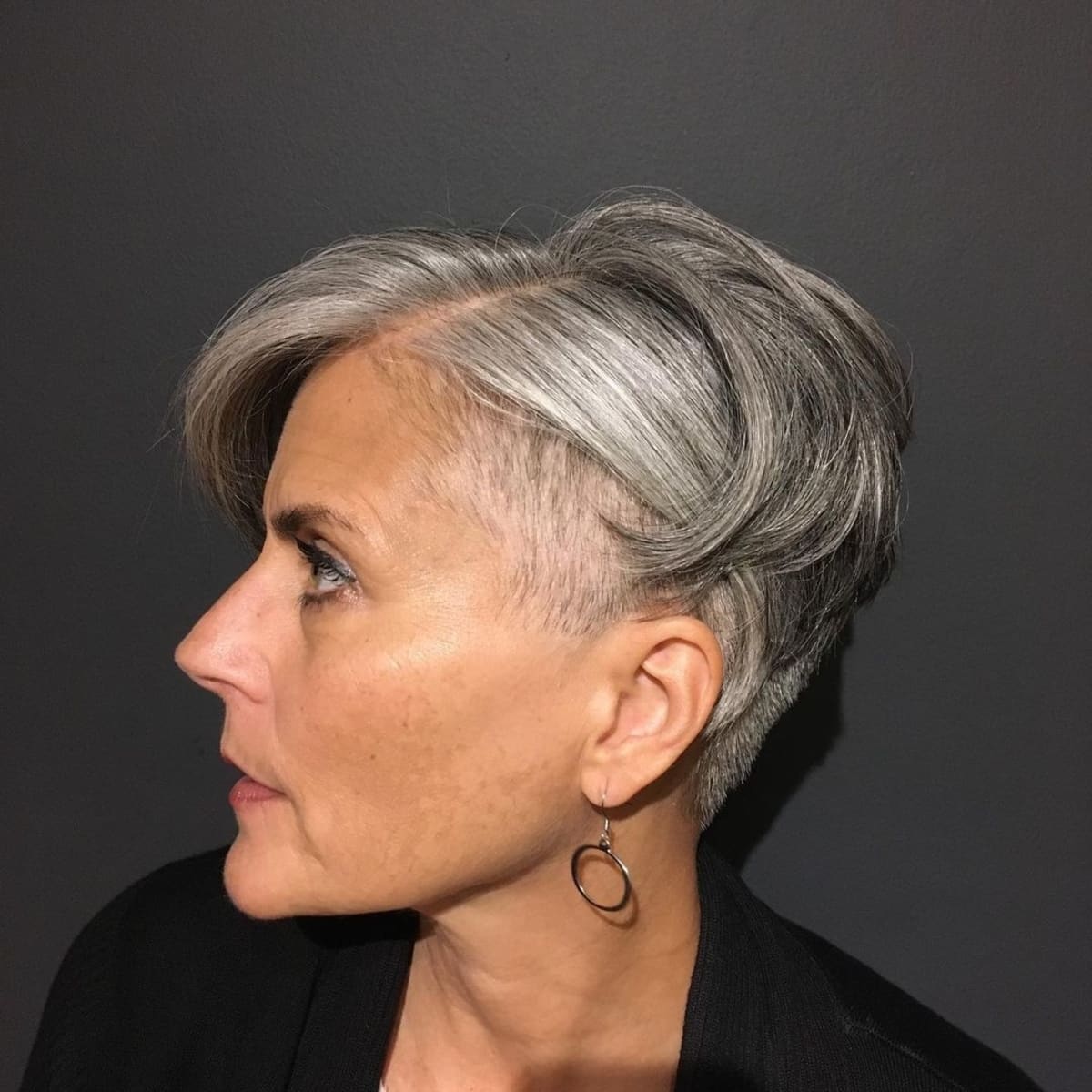 A stylish undercut pixie for women with grey hair has a lot of texture for movement and piecey-ness. Ask for clippers around the ears and nape and a short textured crop on top. Use some wax from Hairstory to show off your texture. Use small amounts in your fingertips for product control and work into your hair until you add more body and achieve your desired, younger look.