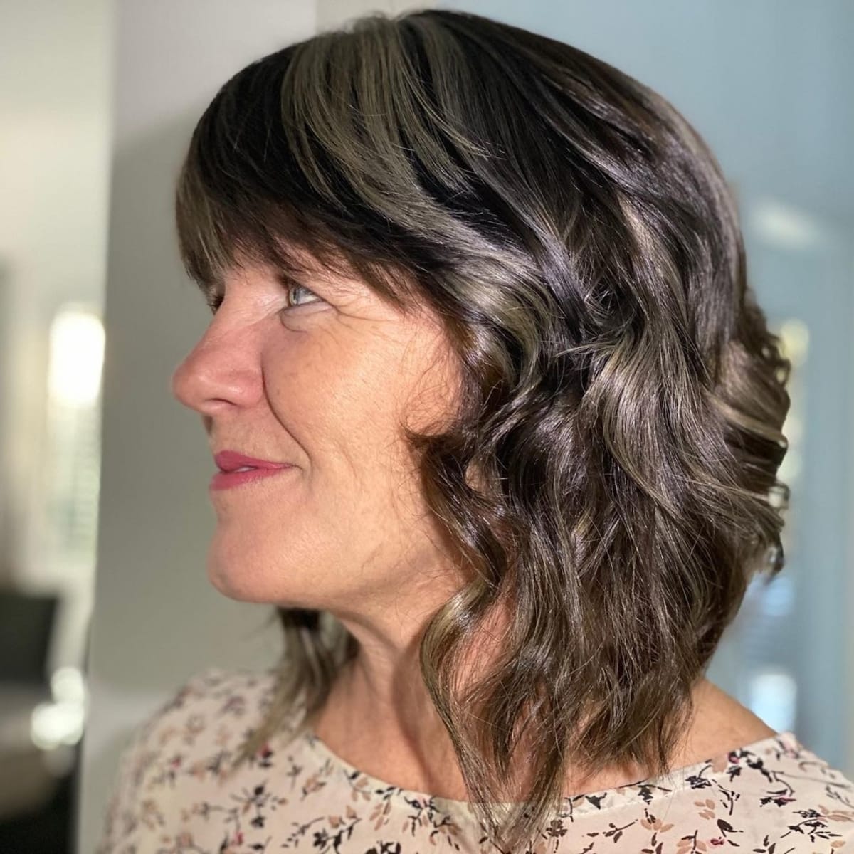 A trendy lob with relaxed waves offers an effortless, youthful appearance to anyone who sports it. With its soft finish, it reduces the appearance of wrinkles on the face.