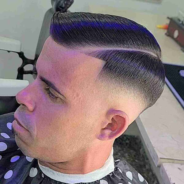 This is a slicked-back hard line hairstyle, also referred to as a disconnected pompadour cut with a hard part. The most appealing aspect of this look is the hard part that can transform the entire appearance in just 3 seconds.
