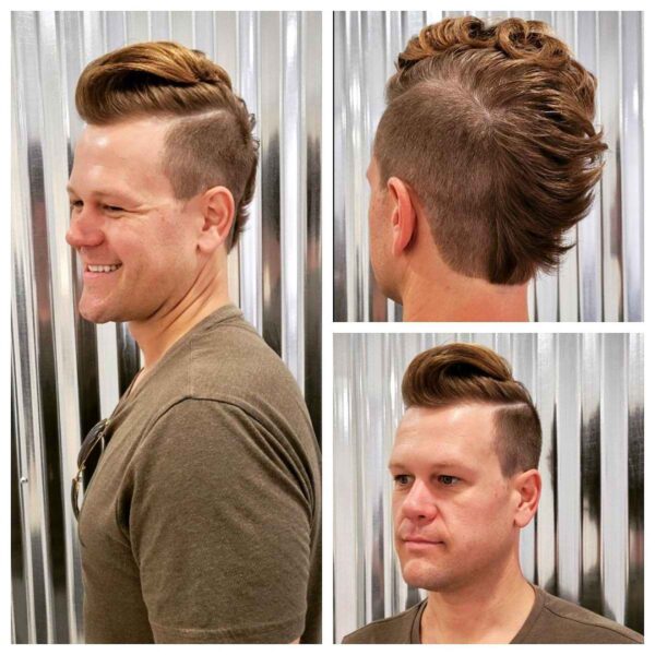 If you’re searching for a stylish twist on the classic mohawk, consider a hard part mohawk. The defined hard part, pompadour, and dual fade haircut create an office-appropriate men’s look while still embracing its punk rock heritage.