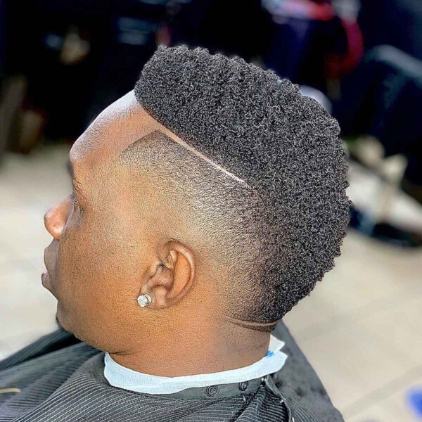 Having a defined hard part on afro hair marks the transition into the top. This style has been shaped into a mohawk, and the hard part has been razored in to enhance the definition; it has been faded down to the skin around the ears and tightly worked into the top.