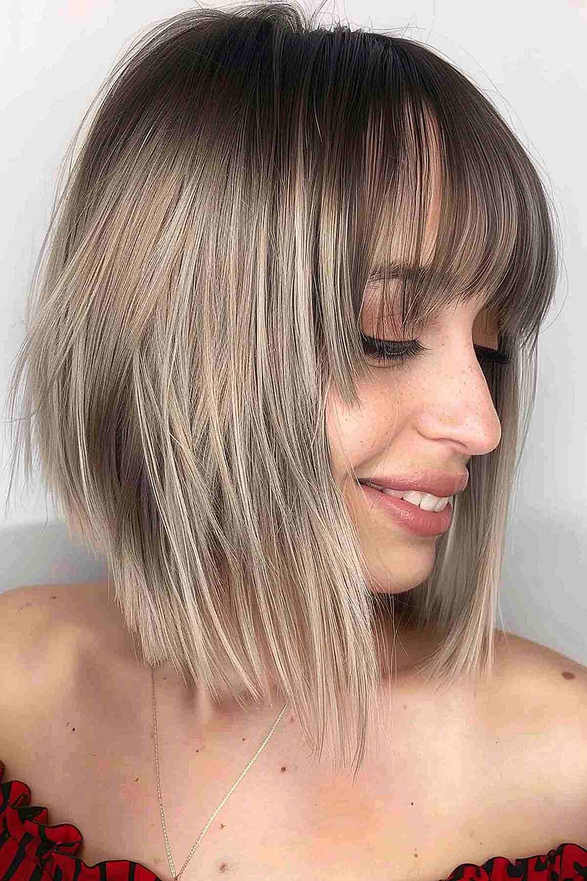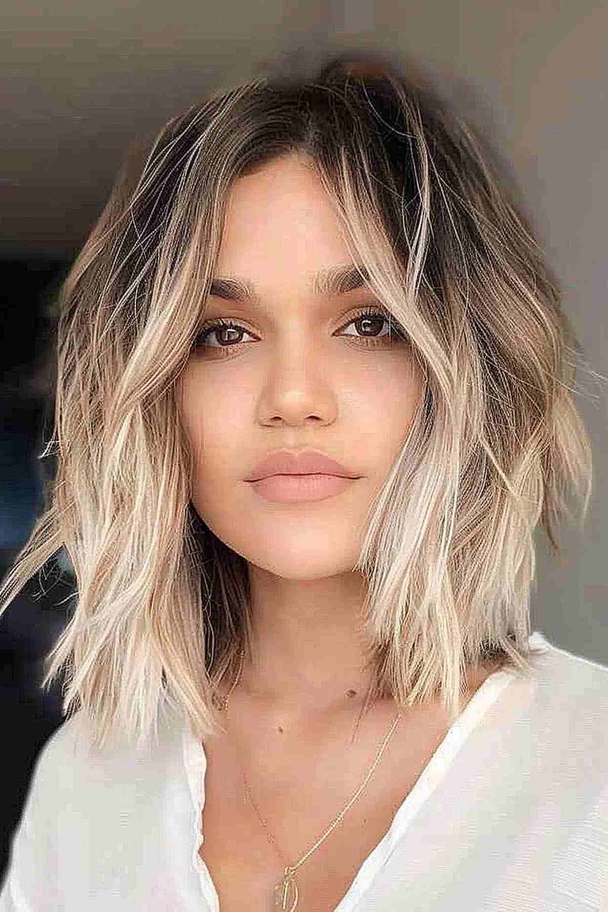 This textured long bob is perfect for a beachy, layered appearance. The soft balayage from darker roots to platinum blonde tips adds depth and a sun-kissed glow, ideal for medium to thick hair. The choppy layers enhance natural waves and give a breezy, effortless style. It’s great for round and heart-shaped faces, providing volume and movement. However, be mindful that the light color can require more upkeep to keep it looking fresh and vibrant.