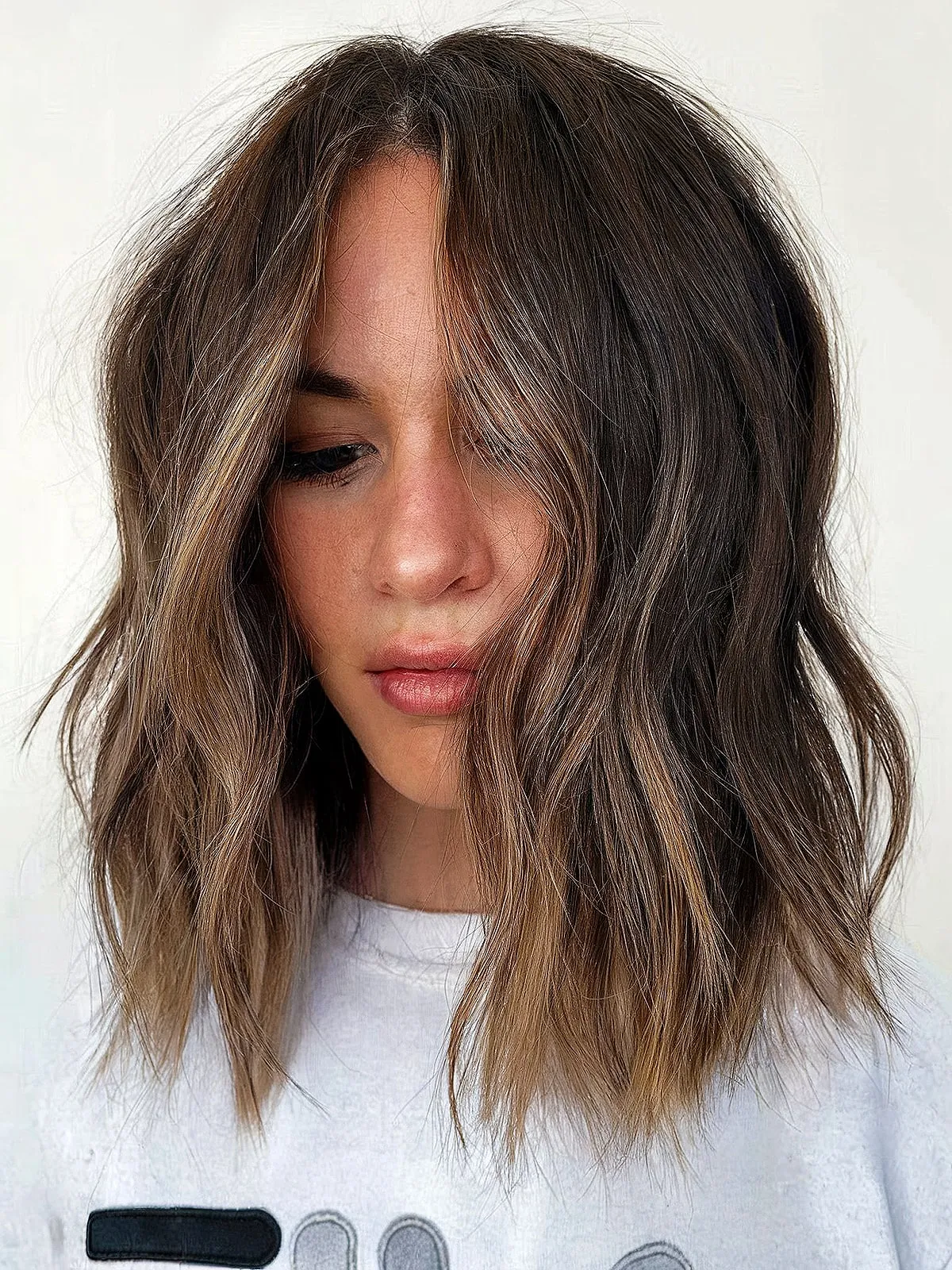 A textured lob with layers is a shaggy shape with lots of character. The best way to achieve the airy shape is to have your ends texture cut. Ask for point cutting or razor cutting for wispiness. Your shape should have medium layers and a soft fringe. If you want your curls to be messy with straight ends, I advise leaving them out when you curl them. And add a texture paste when styling.