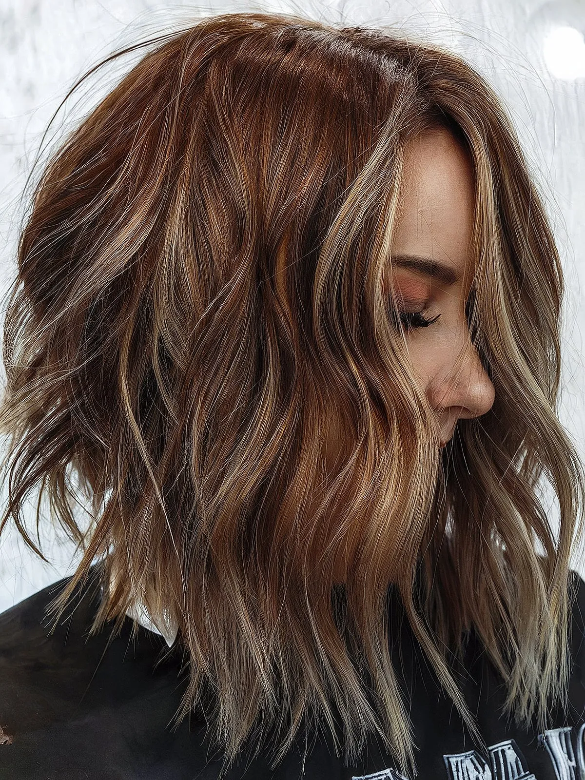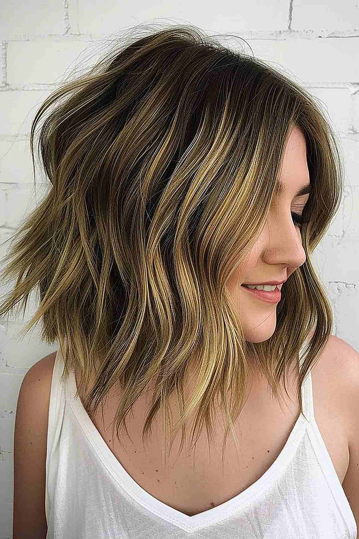 Rock your locks in a textured cut complemented by gentle highlights. This color is easy to adjust to fit all hair types, making it one of the top choices. Lobs also give you a chic look while maintaining length and style. Try styling with a wand for sultry beach waves.