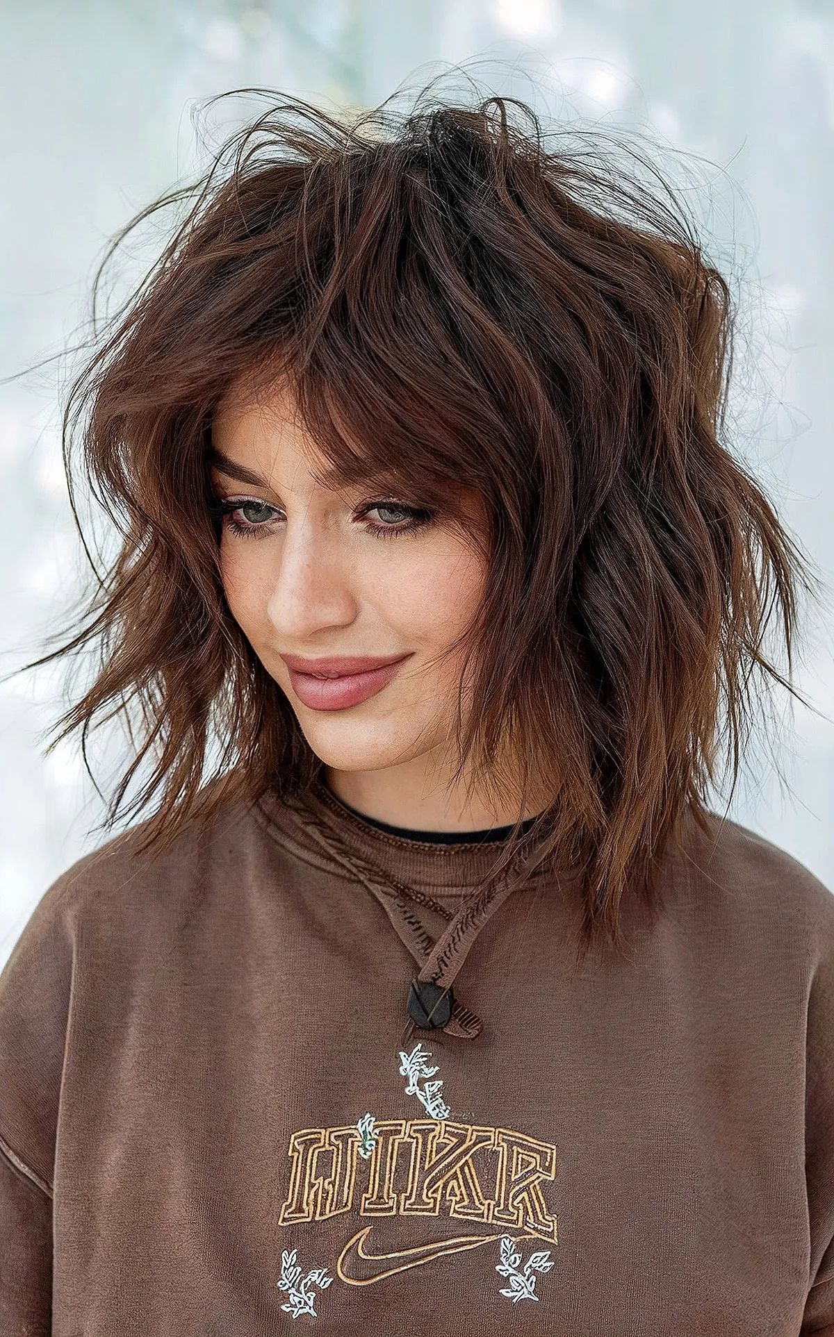 This chic long choppy bob with bangs is perfect for those wanting a trendy, youthful style with minimal fuss. The shoulder-length cut features textured layers that add volume and movement, ideal for medium to thick hair. The full, blunt bangs frame the face beautifully, enhancing your eyes and cheekbones. This style is great for those with naturally wavy hair, as it accentuates the natural texture. However, it may require regular trims to keep the bangs looking sharp and prevent the layers from becoming unruly.