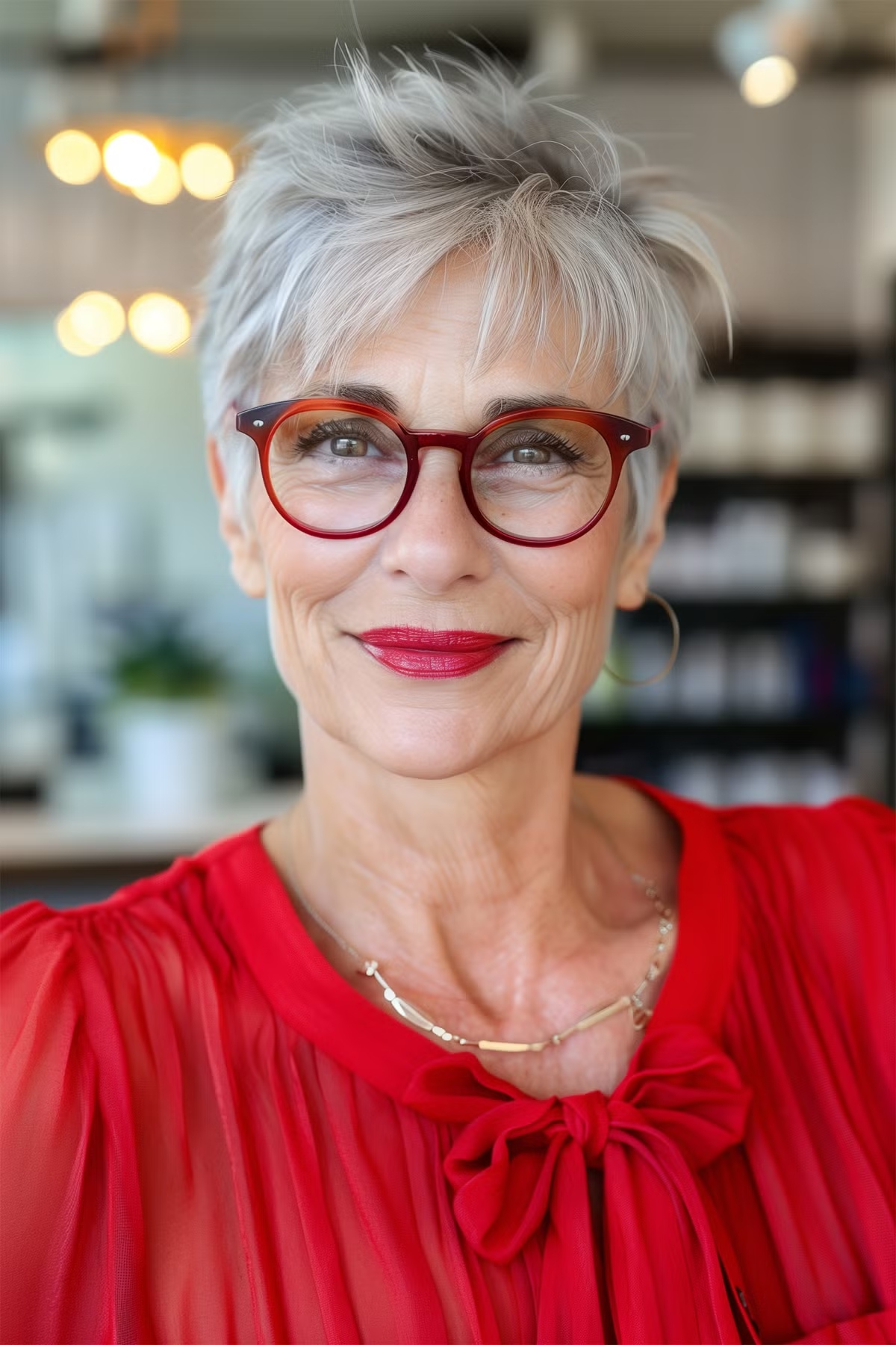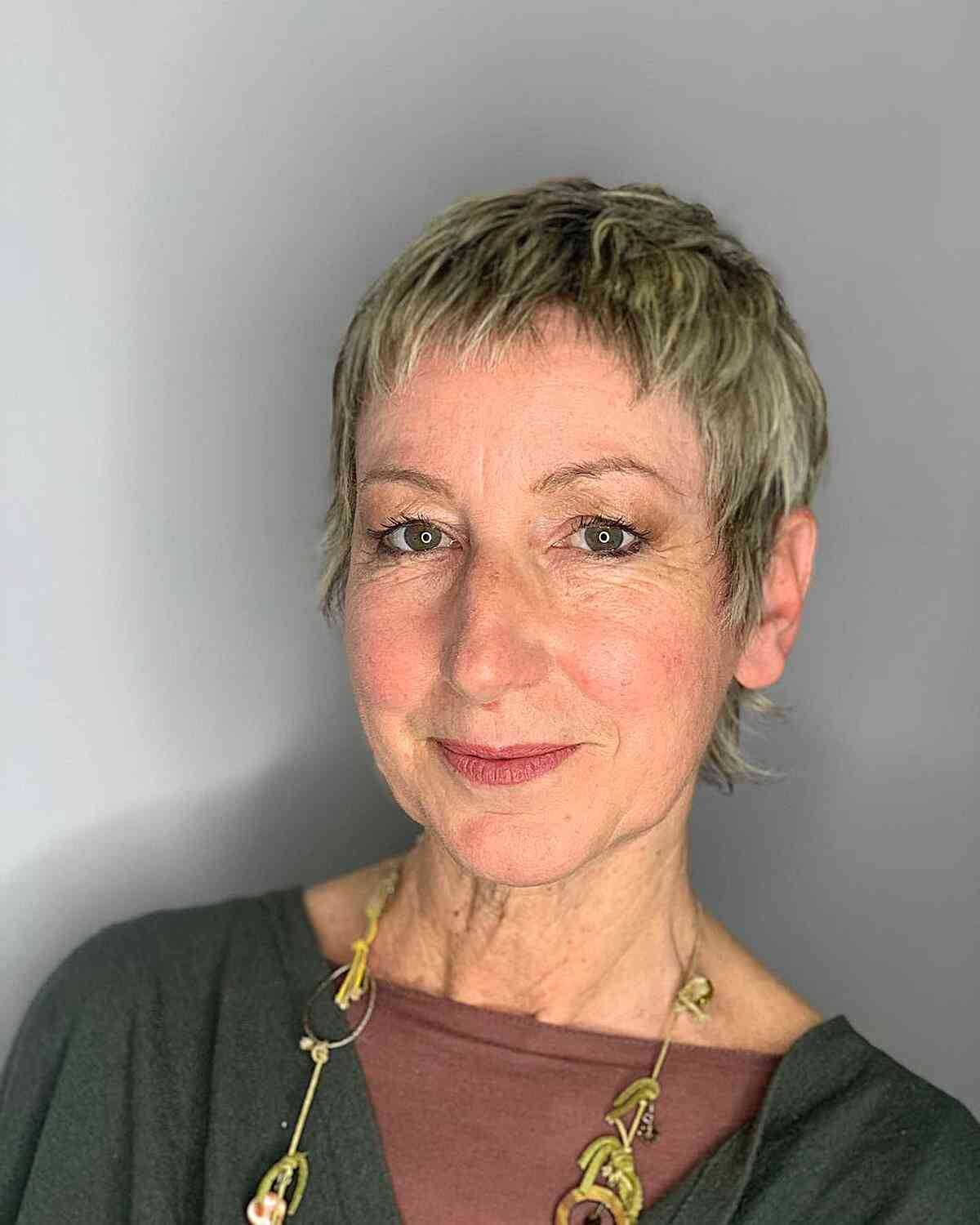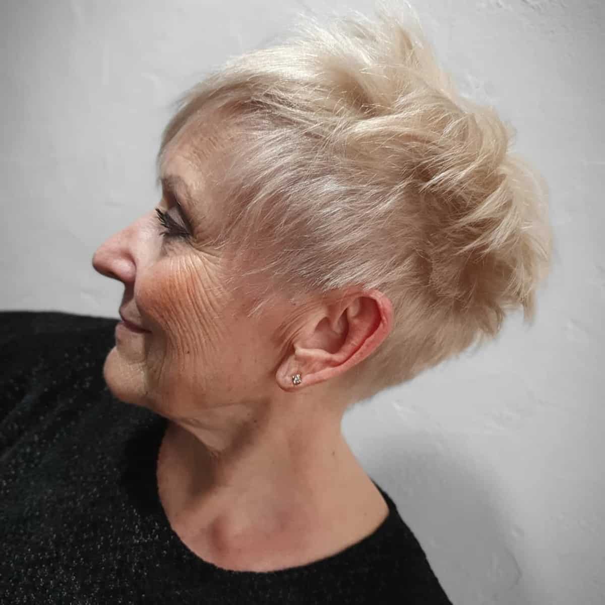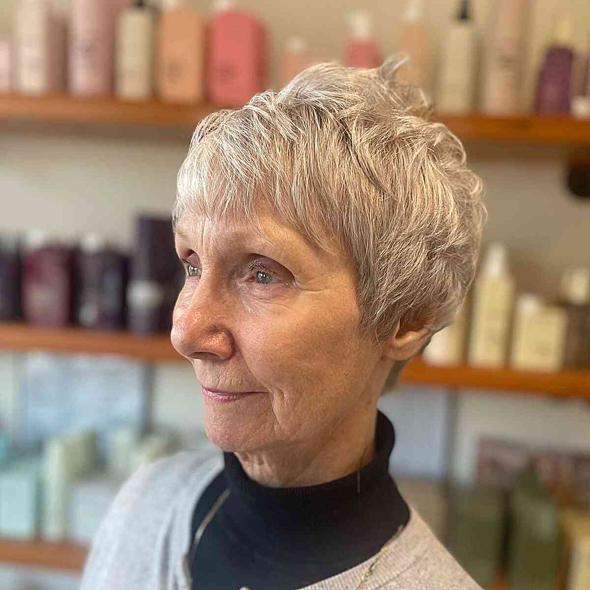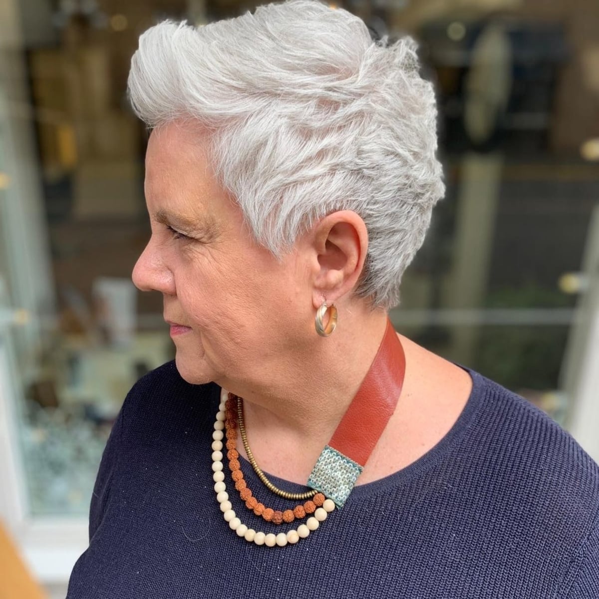 A stylish pixie haircut for mature women over sixty with fine hair works beautifully on a natural silver hue. Pairing your natural color with a well-crafted pixie cut will enhance your features and texture. Good communication is pivotal, so take the time to research a stylist before your transformation.