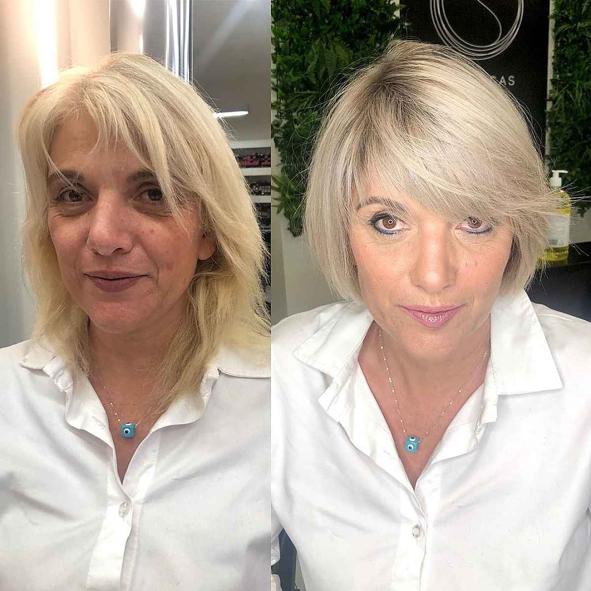 For the elegantly aged ladies, a stylish blonde crop on short hair with side bangs is an excellent makeover option. It’s fresh yet refined, and simple to maintain. For finer hair, blonde shades assist in creating a fuller appearance. The look can be easily recreated at home with a flatiron and light hairspray.
