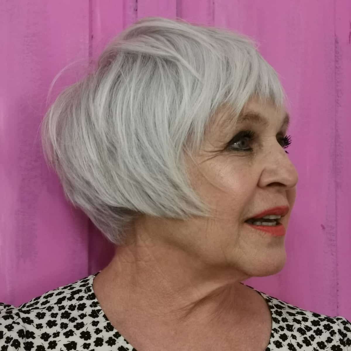 A chic crop with delicate bangs for older women is a stylish cut that suits straight, fine tresses.